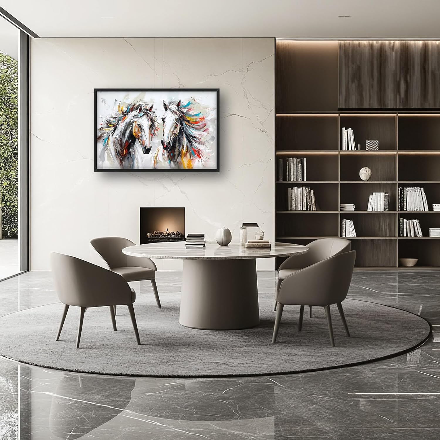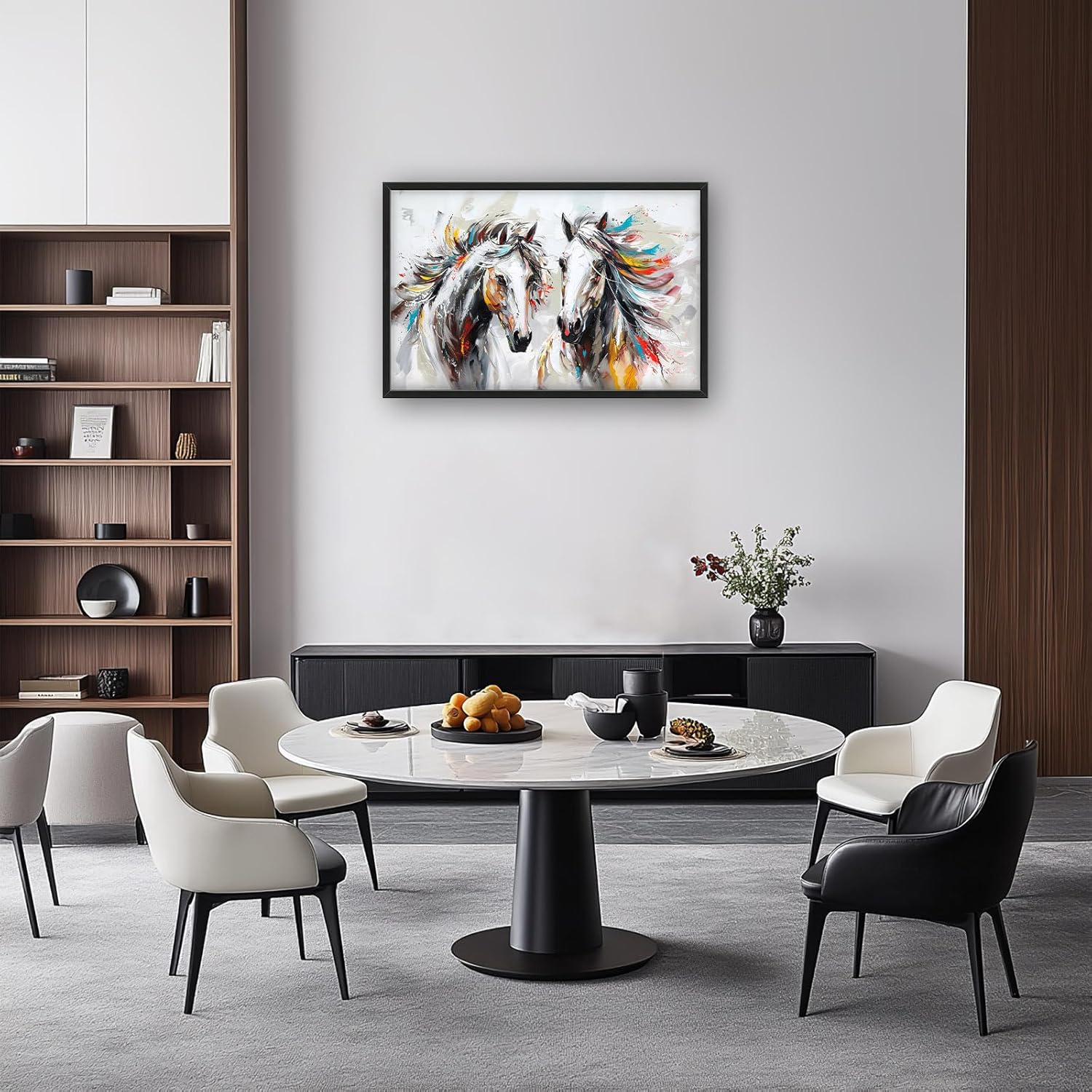 • 【Unique Design】Two horses with flowing manes, white background, colorful oil painting style, large brushstrokes, strong contrast between light and dark, fast running posture, bright colors, high saturation, strong sense of dynamism, elegant lines, gorgeous atmosphere.