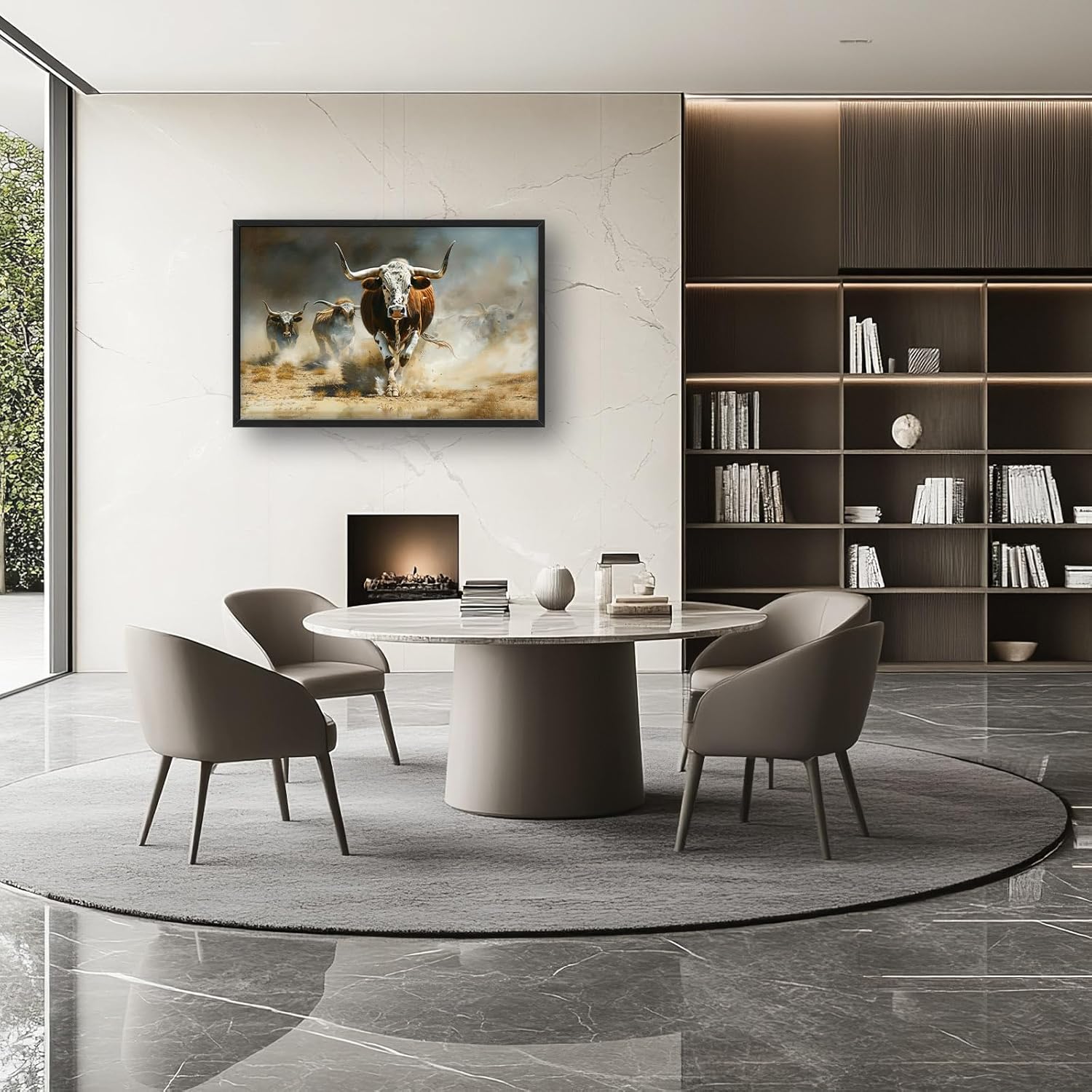 • 【Unique Design】An oil painting of longhorn cattle running through a dusty landscape, realistic and cinematic in style.