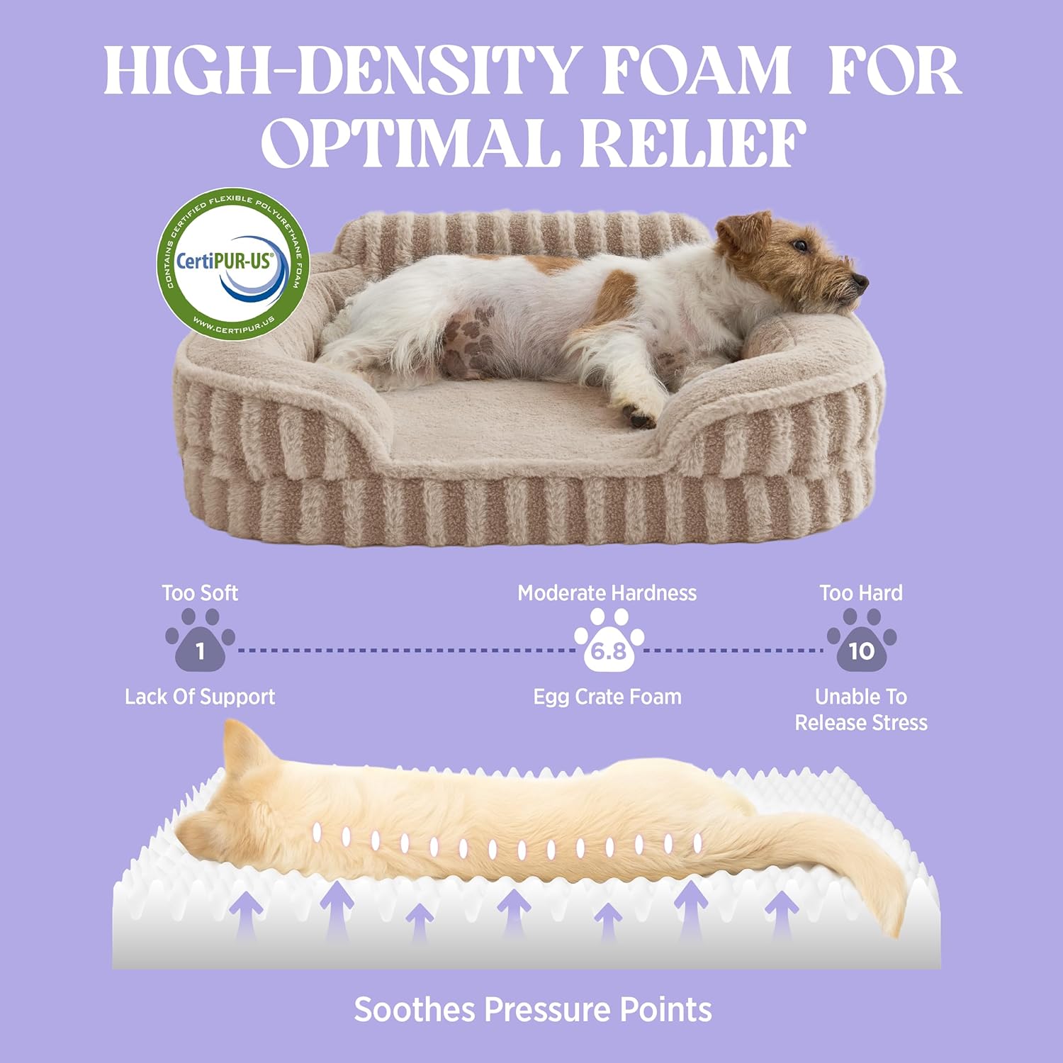 • Plush Comfort:Designed with thick egg crate foam that provides gentle, orthopedic support to relieve pressure on aching joints. This dog sofa is wrapped in an ultra-soft faux fur outer layer that creates a warm, soothing surface your pet will love to curl up on.