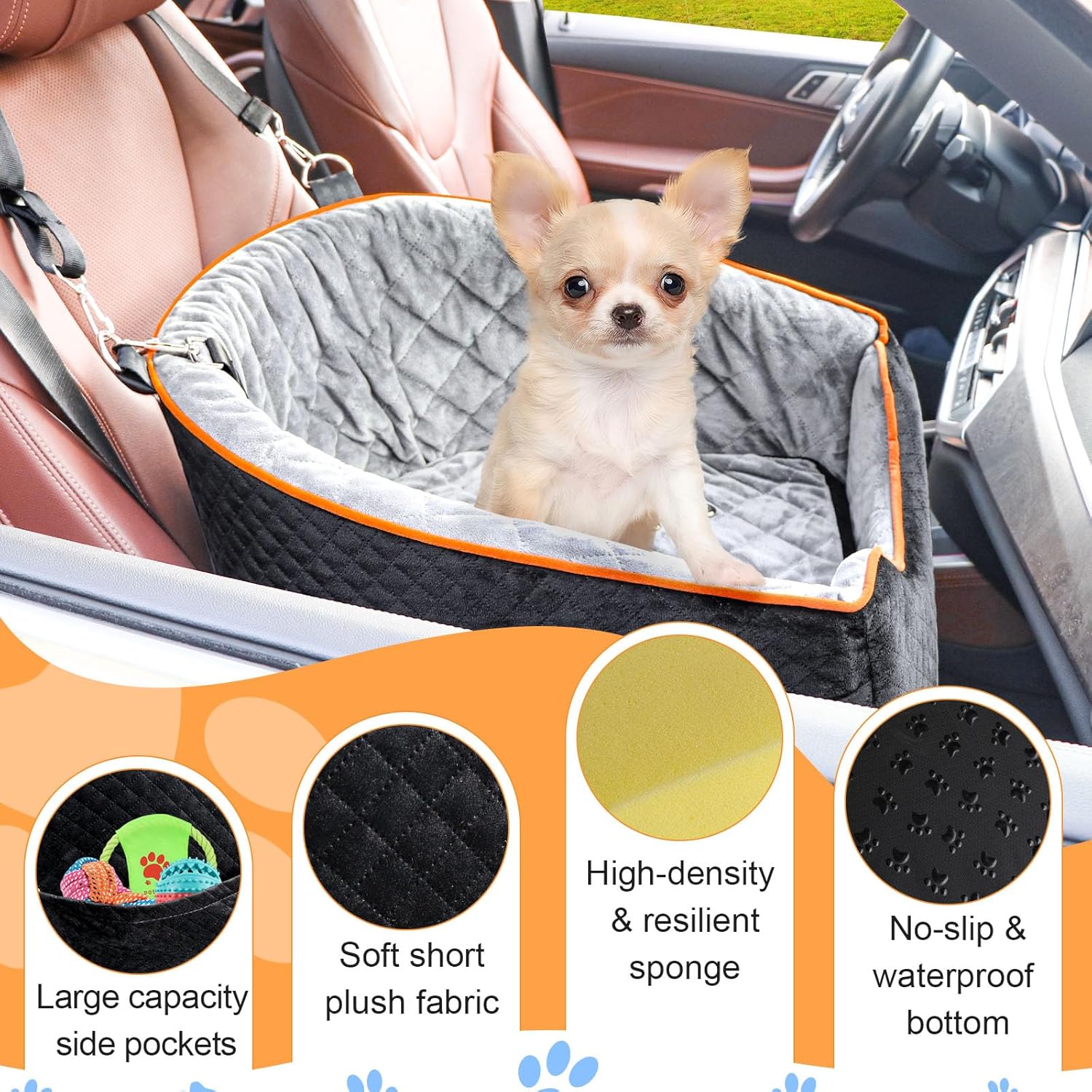 - Comfortable and Secure: The pet car seat is made of high-quality breathable fabric with a super soft plush rim, providing plenty of room for small dogs to readjust and get comfortable. The firm foam construction maintains its shape, offering a soft and cozy place for your dog to relax in extreme comfort. The non-slip bottom and safety tethers ensure that both your dog and the seat stay securely in place, preventing any sliding around while driving.