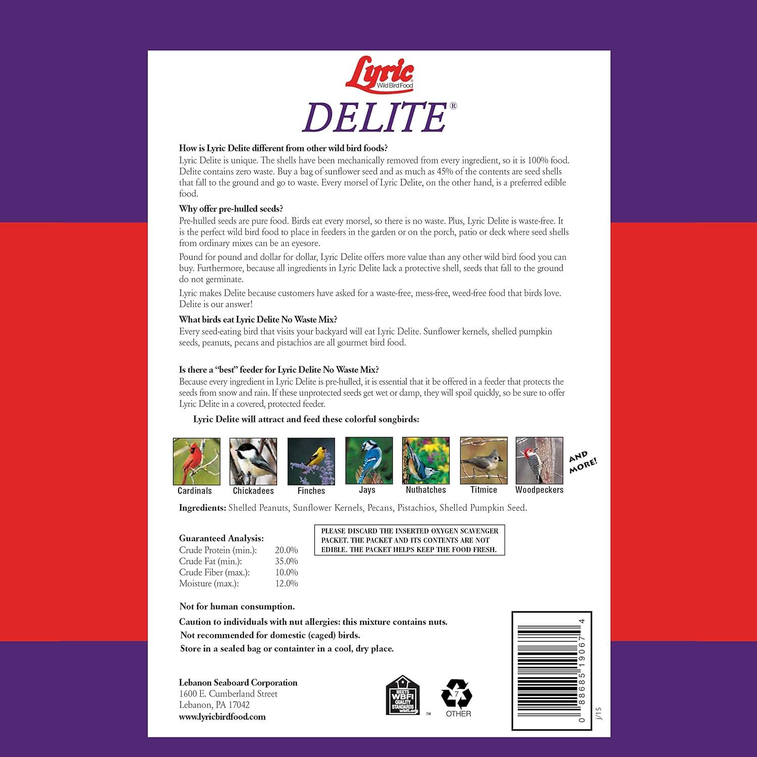 • INVITES A VARIETY OF WILD BIRDS: Attract cardinals, chickadees, finches, jays, nuthatches, titmice, woodpeckers, and more with the Lyric Delite No Waste Bird Seeds for outside wild birds