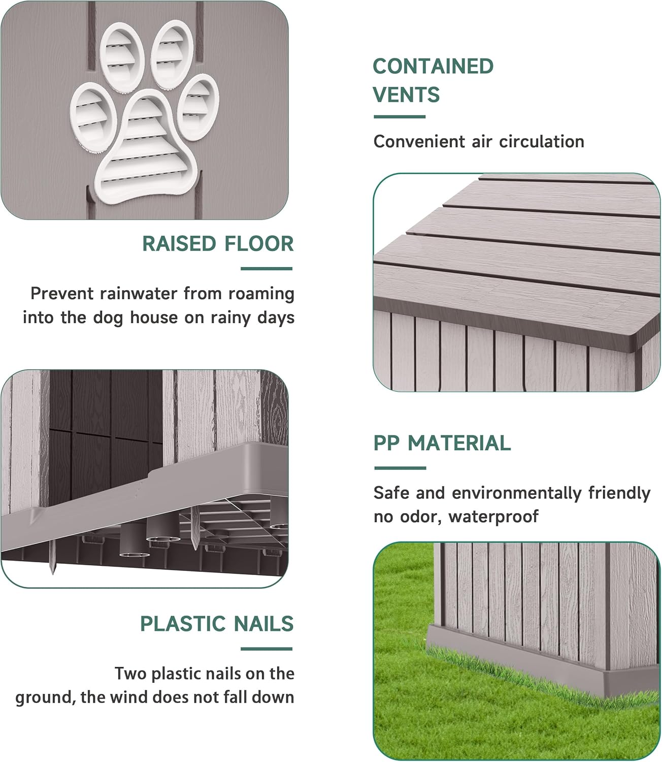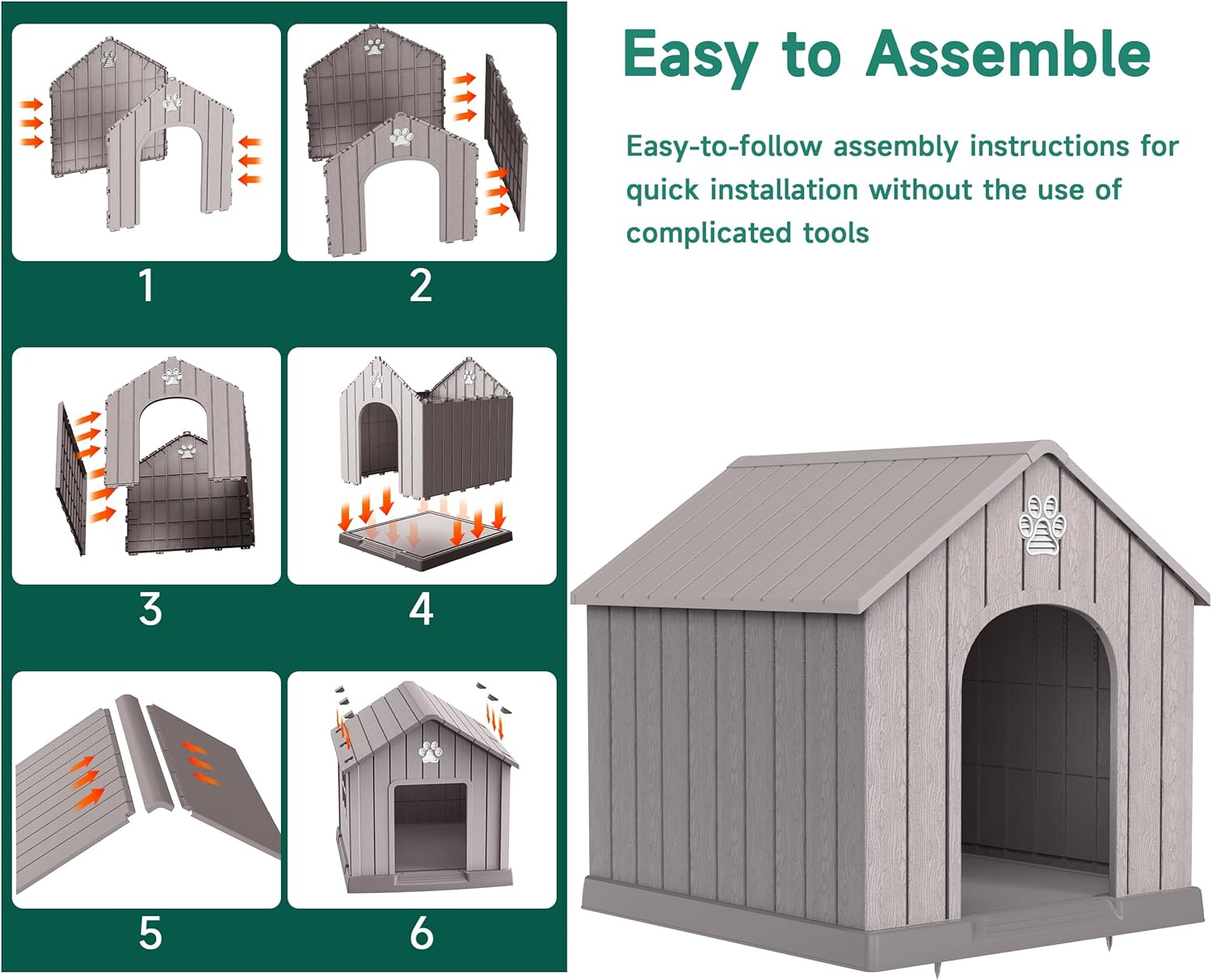 • Sturdy and Durable: This big dog house is made of high quality PP (polypropylene) material, which is extremely durable.The PP material is scratch-resistant, abrasion-resistant, and also waterproof. It can withstand all kinds of weather conditions, such as rain and sunlight exposure, and is not easily damaged.