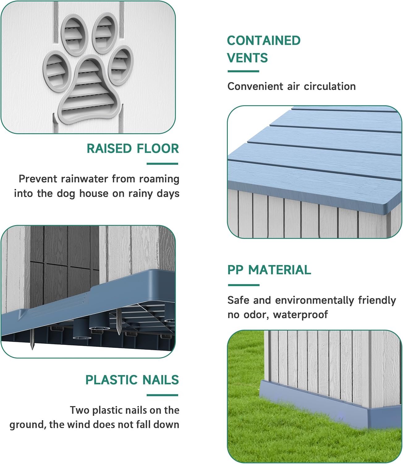 • Sturdy and Durable: This big dog house is made of high quality PP (polypropylene) material, which is extremely durable.The PP material is scratch-resistant, abrasion-resistant, and also waterproof. It can withstand all kinds of weather conditions, such as rain and sunlight exposure, and is not easily damaged.