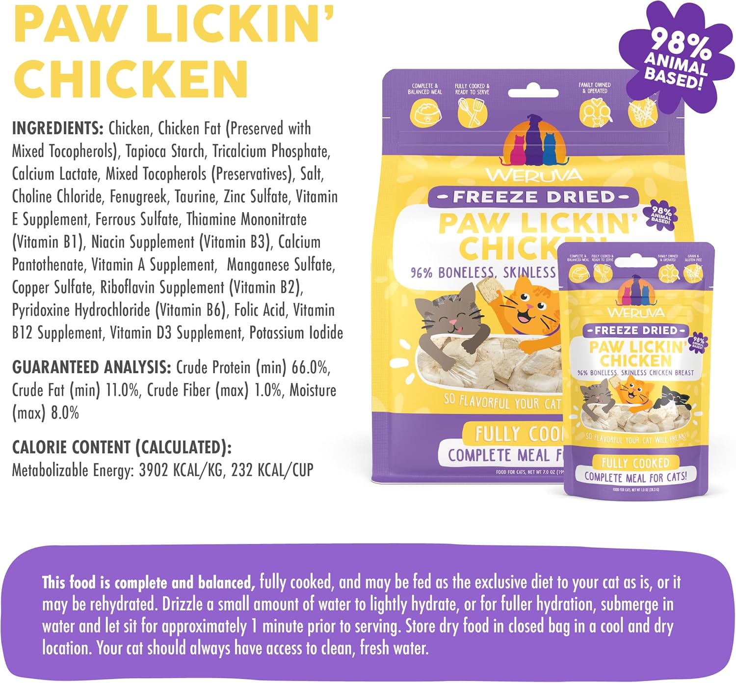 • Weruva Cat Freeze Dried Paw Lickin' Chicken, 7oz Bag. Gently cooked boneless, skinless chicken breast with healthy fats and fenugreek. No bones or organs