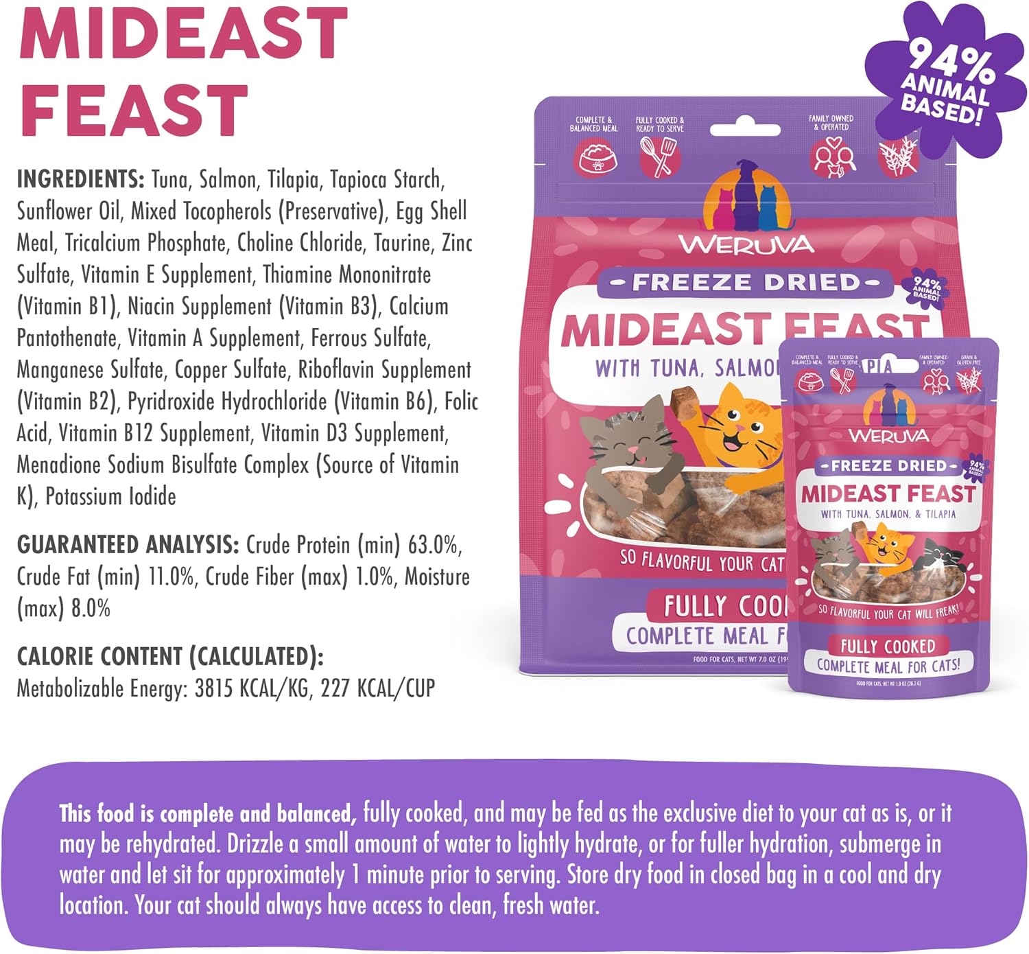 • Weruva Cat Freeze Dried Mideast Feast, 7oz Bag. Gently cooked tuna, tilapia, and salmon with sunflower oil. No bones or organs