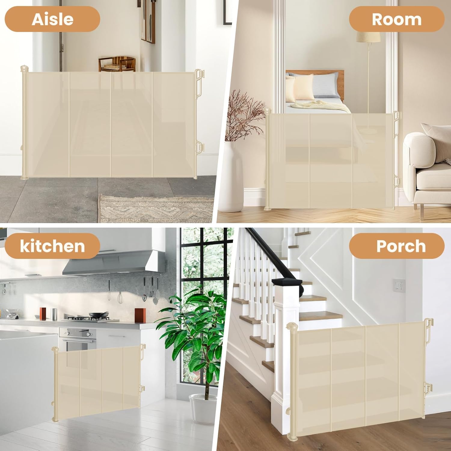 • 【Fits Your Purpose Perfectly】- The retractable baby gate is a perfect solution for providing safety and secruity space for children and pets. It is used for children and pets blocking off their way out or in. It's suitable for the kitchen, bedroom, living room, stairs, and other off-limit areas inside your home, providing a safe area for your little one. For use in both indoor and outdoor spaces.