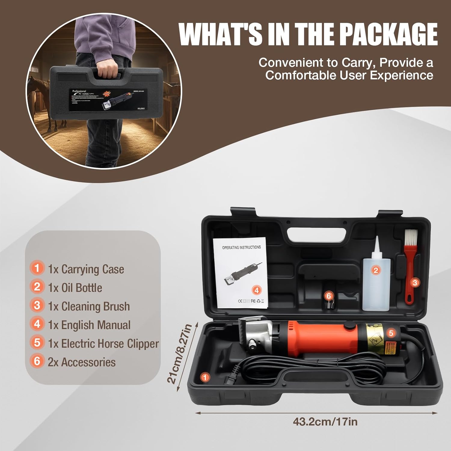 • 【HIGH EFFICIENCY】: Compared with the traditional manual scissors, this electric horse clipper is equipped with a 350W high-powered copper motor with a no-load speed of 2400r/min, which greatly improves the efficiency, making it ideal for farm breeding.