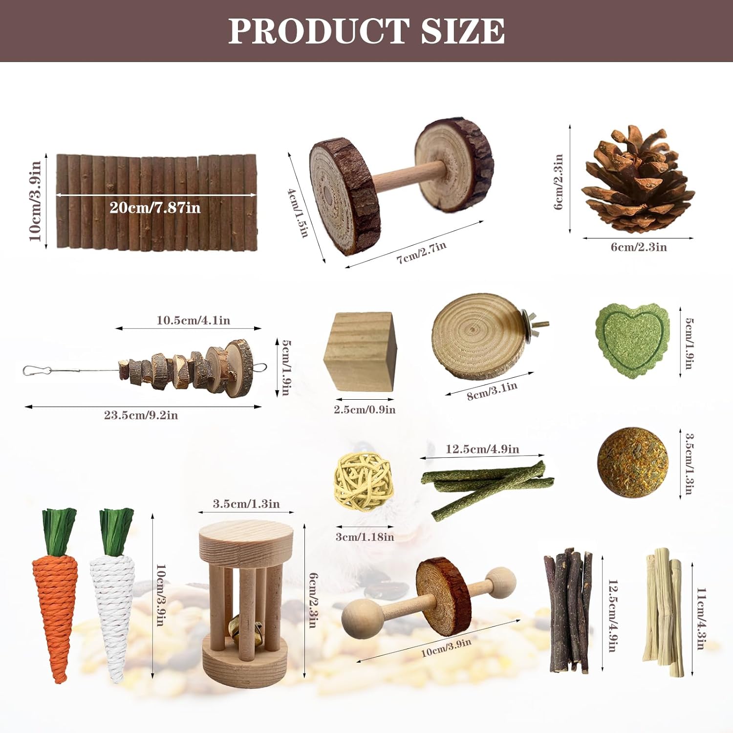 • 【Hamster chew toys sets】Our hamster chew toy set includes: 1* apple branch molar skewer, 4.1*1.9in. 1* bendable wooden bridge, 7.8*3.9in. 1* unicycle, 3.9*1.7in. 2*Rattan ball,1.1in. 20g apple twig,4.7in. 3*grass stick,4.9in. 1*Bell Roller,2.4*1.4in. 2*Grass Carrot Toy,3.9in. 50g* sweet bamboo, 4in. 1*timothy hay cake,1.4in. 1*timothy hay ball teeter,1.9in. 1* chinese pine,2.3*1.9in. 1* Wooden Dumbbells,2.7*1.5in. 1*Round Wooden Standing Platform,3.1in. 2*Wooden molar blocks,0.98*0.98in.
