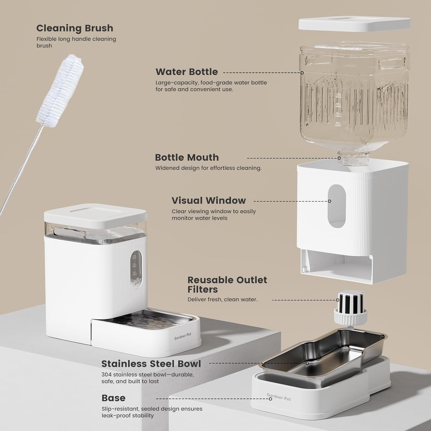 • Premium Pet-Safe Materials - Gardner Pert dog water bowl dispenser comes with 304 stainless steel bowl + cleaning brush guarantees a safe, easy-to-clean water supply for pets.