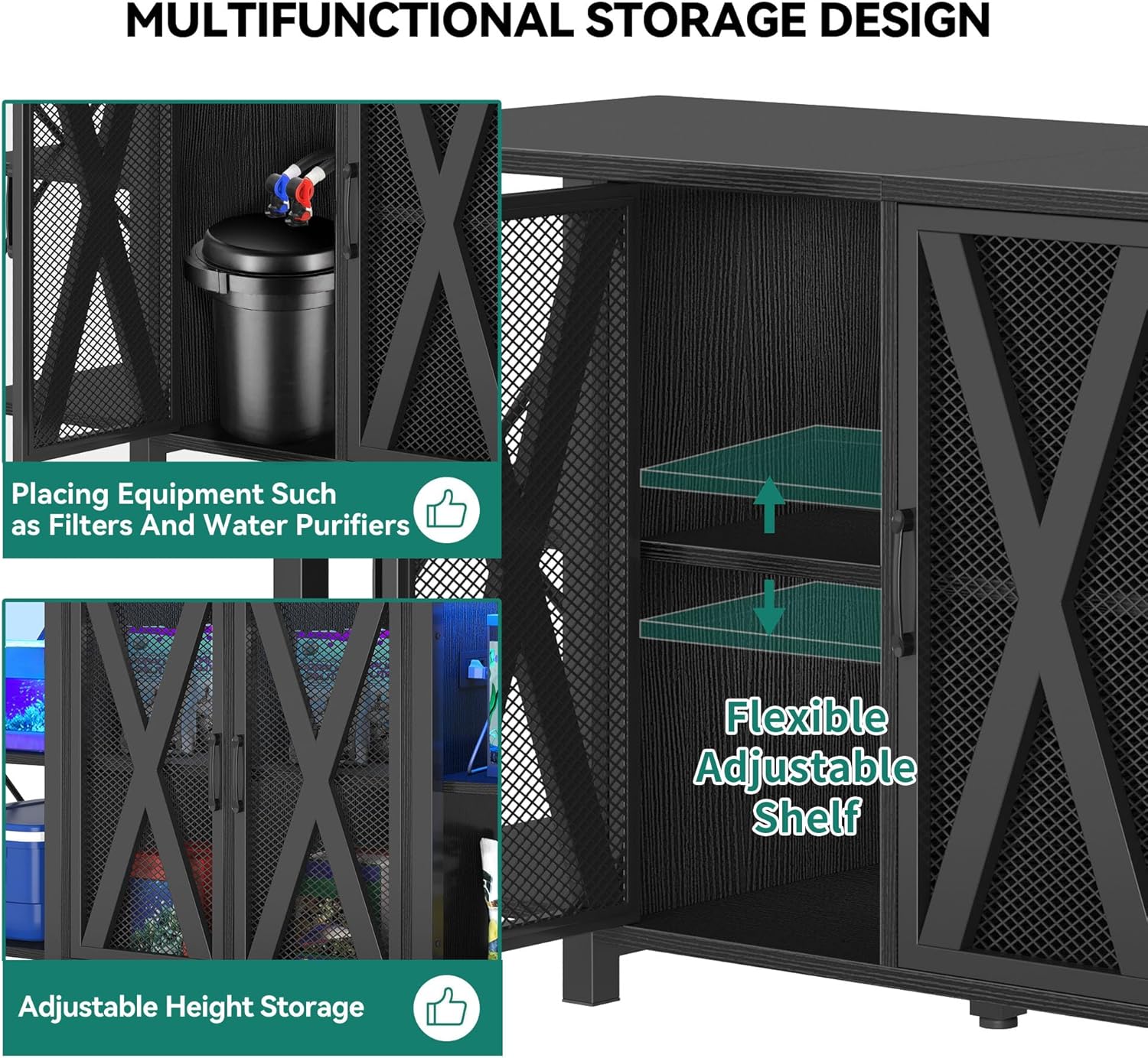 • Storage Efficiency: Maintain order with our fish tank with stand features for fish food, tools, and accessories. Adjustable shelves cater to items of all sizes, keeping your aquarium essentials in one place