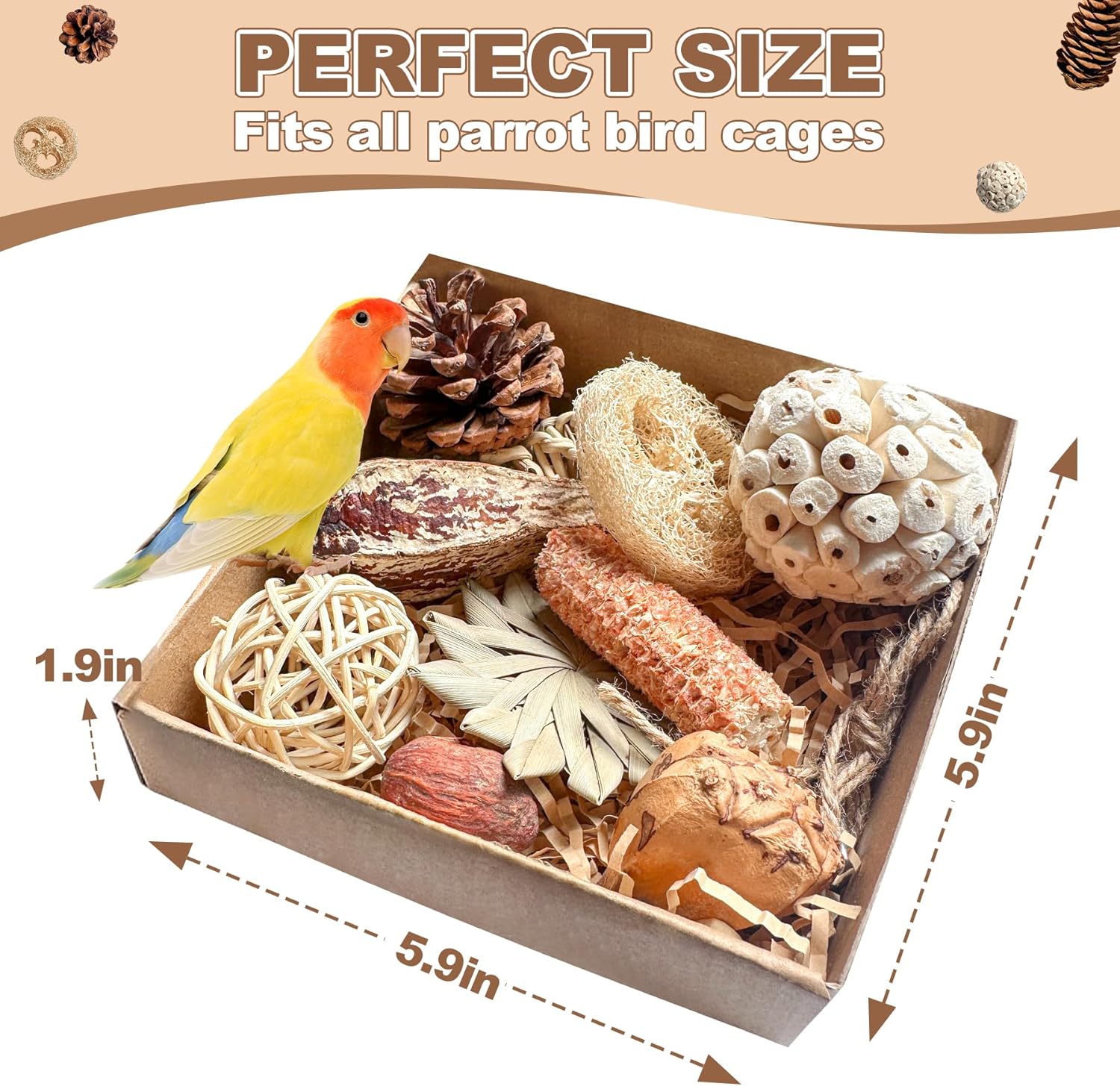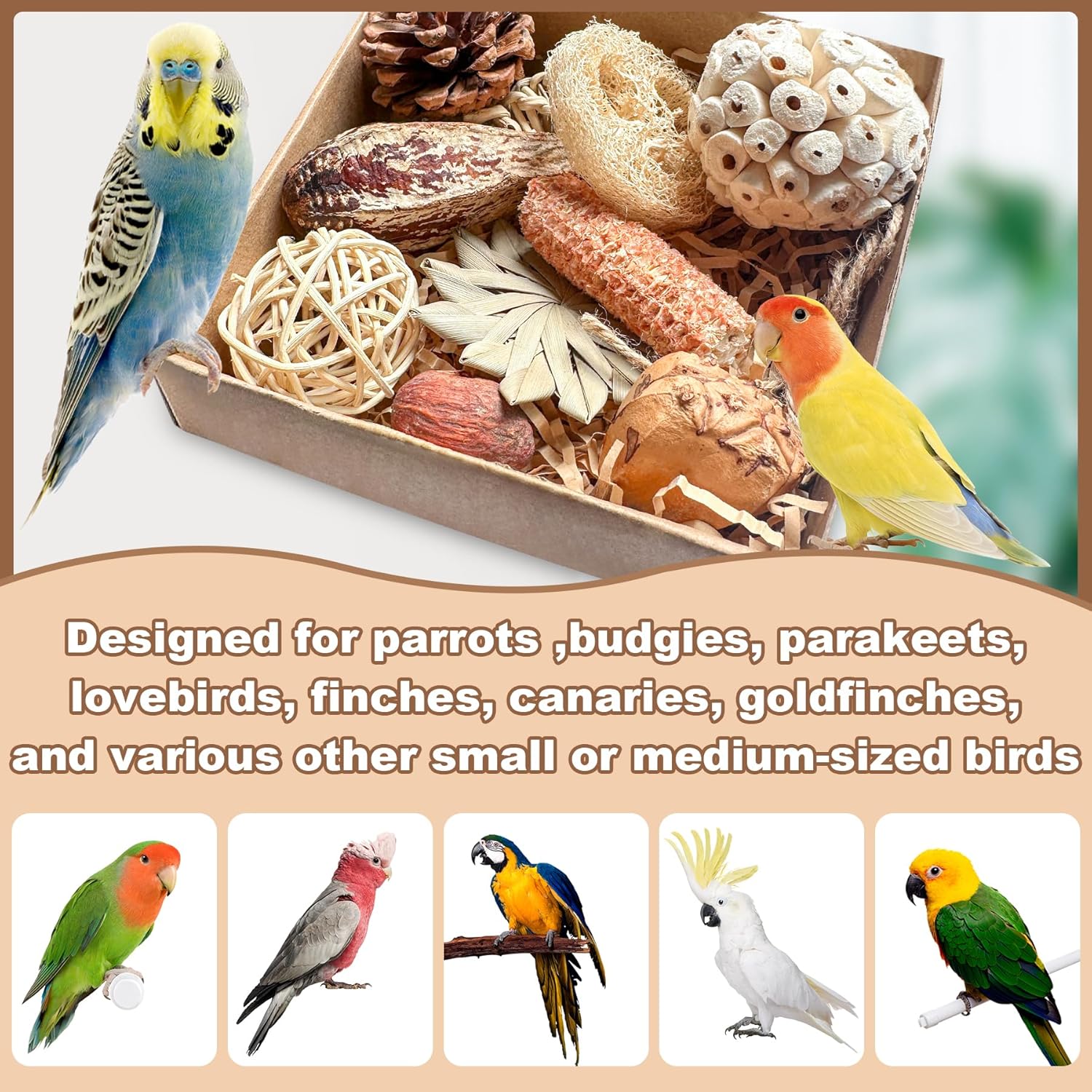 • 🌿 IGNITE NATURAL FORAGING INSTINCTS: The Crimson-bellied Conure toys for medium birds unleash their inner explorer! From crinkly loofah sponges to rugged pine cones with wooden pegs, each piece in our 10-piece set mimics nature’s puzzles. Watch them peck, shred, and problem-solve—turning snack time into a jungle survival challenge