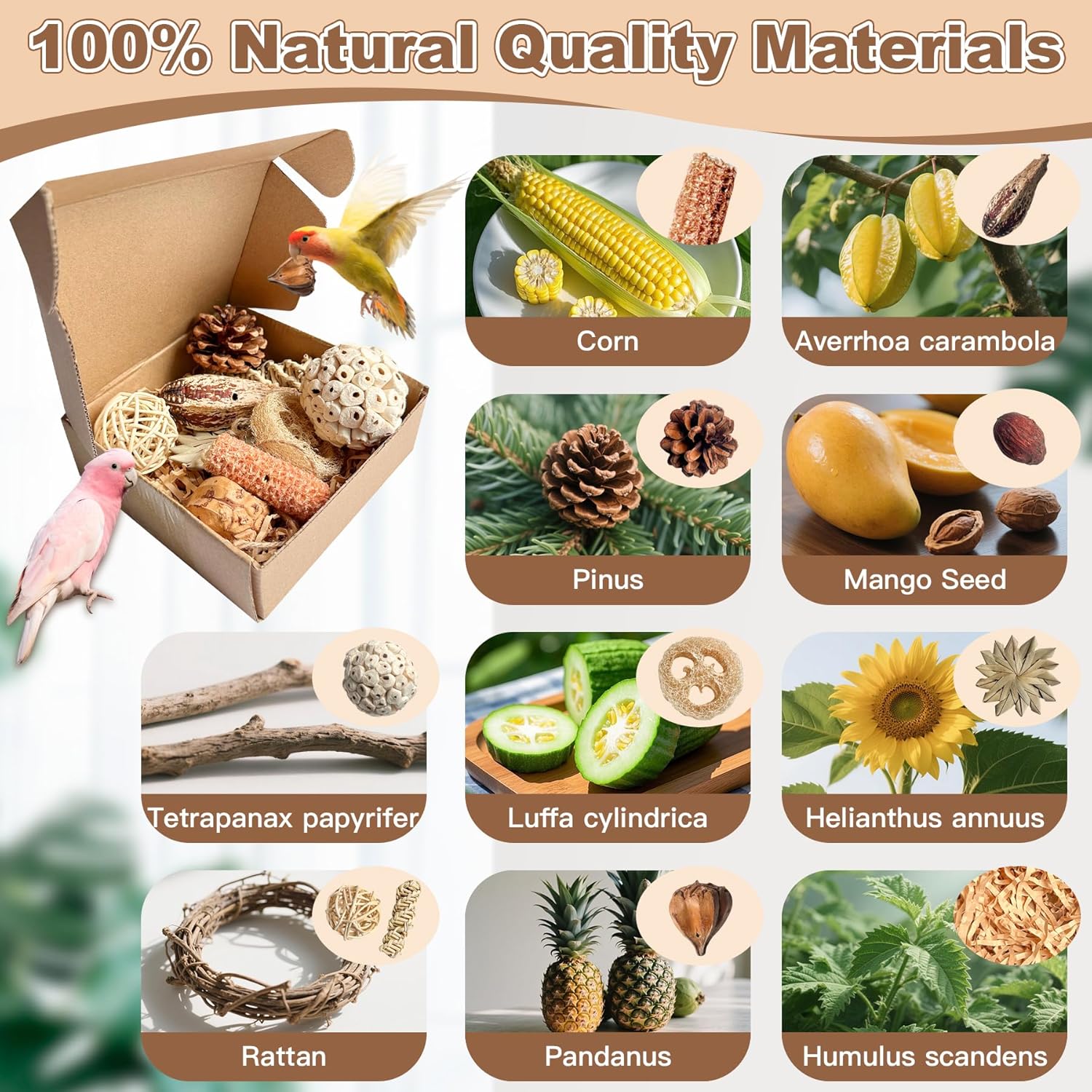 • 🦜 PERFECT FOR EVERY BEAK PERSONALITY: Shredders: Crunchy sunflower leaf discs & tearable grass paper Nibblers: Sweet mango wood & textured palm spirals Tossers: Bouncy sola balls & lightweight Ideal for conures, cockatiels, budgies, and more—no bird left behind!