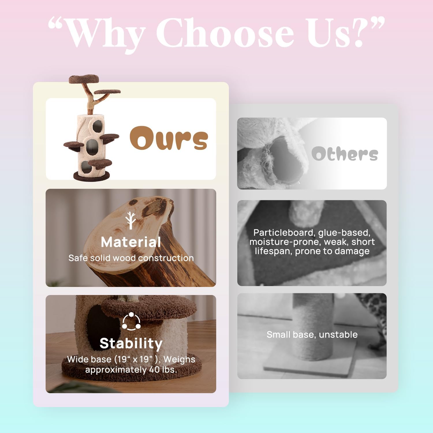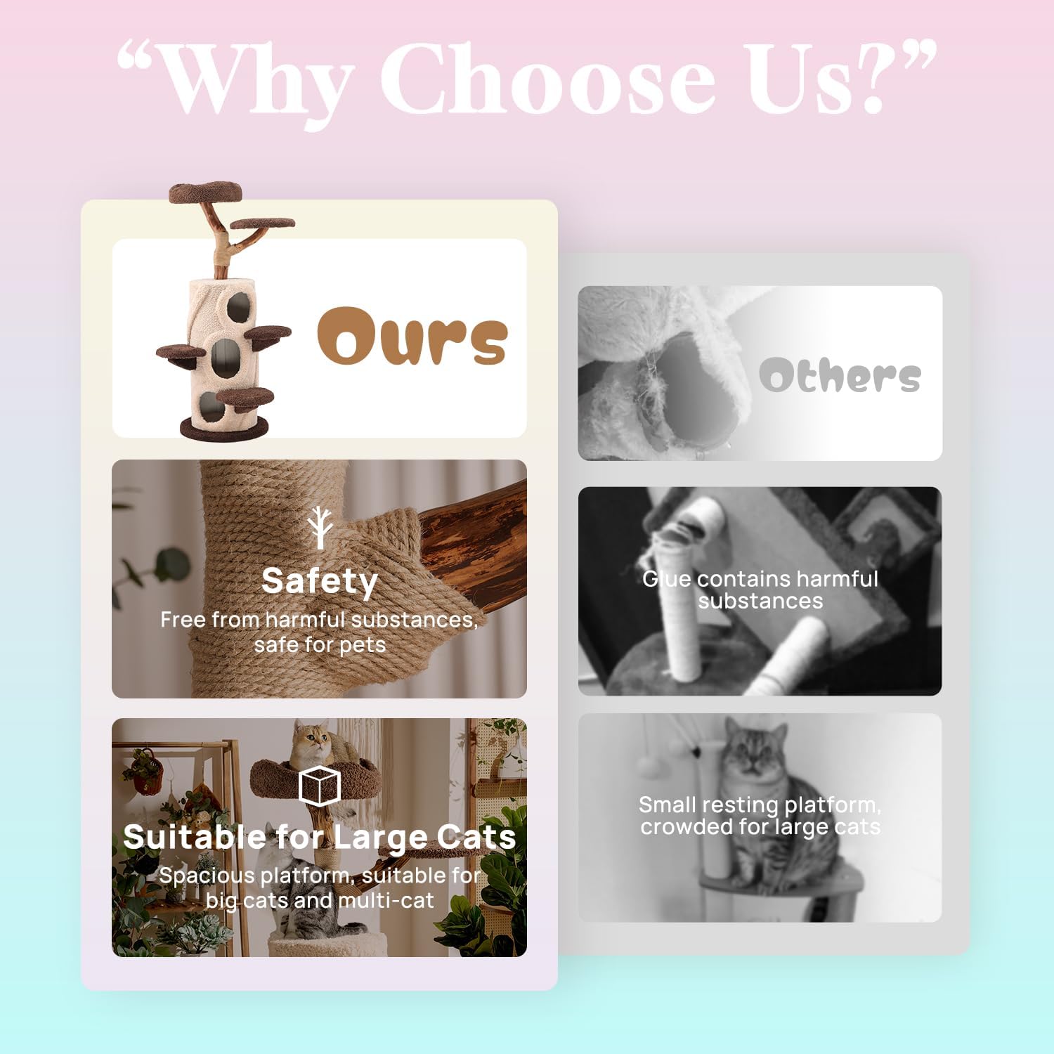 • Premium Eco-Friendly Materials: Cat tower crafted with hand-polished natural fruitwood branches (2-3" diameter) showcasing unique wood grains. Wrapped in durable natural jute rope for extended scratching use. Features an ultra-stable 40.2-lb base (1.2" thick) and E1-certified MDF boards. Compact 0.18㎡ footprint blends seamlessly into home decor.