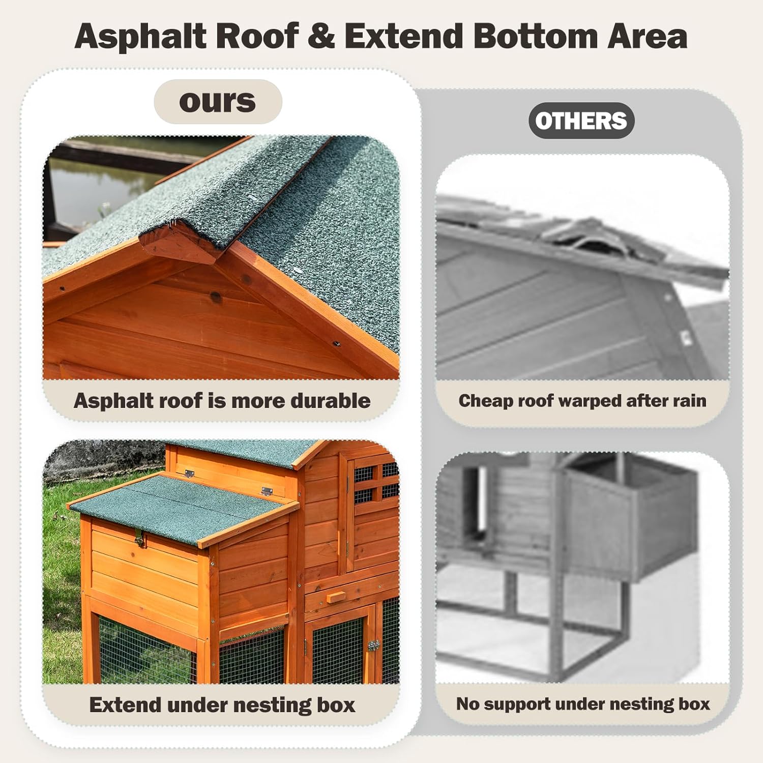 • 【Durable & Weatherproof Construction】Built with solid fir wood and a waterproof asphalt roof, this coop withstands rain, snow, and UV rays. The eco-friendly painted finish protects against rot and pests, while the sloped roof prevents water pooling. Ideal for year-round outdoor use!