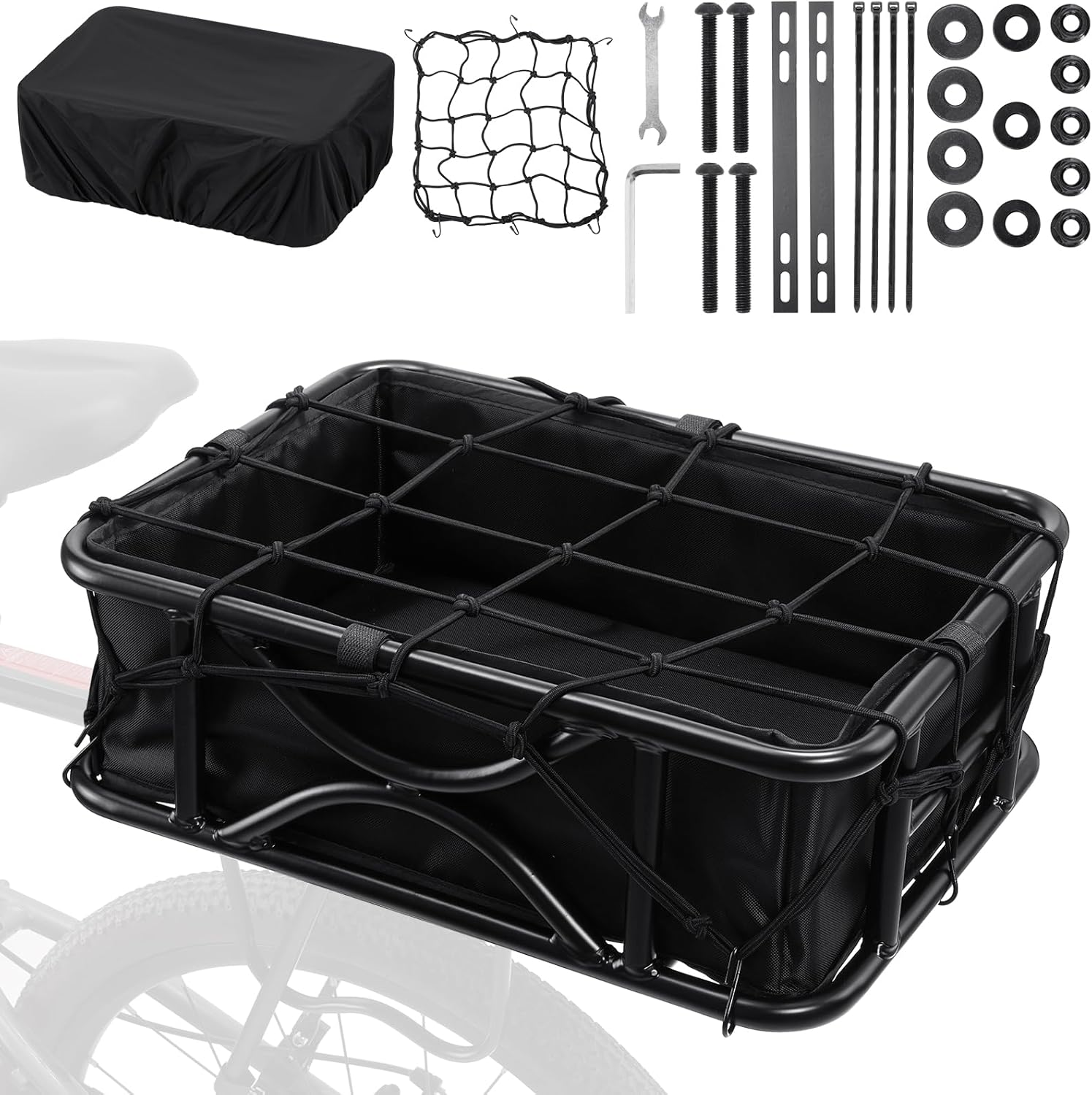 Heavy Duty Rear Bike Basket for Adults, Bicycle Cargo Basket with Removable Liner, Waterproof Cover & Cargo Net, Universal Fit for E-Bike, Mountain Bike, Dog Carrier