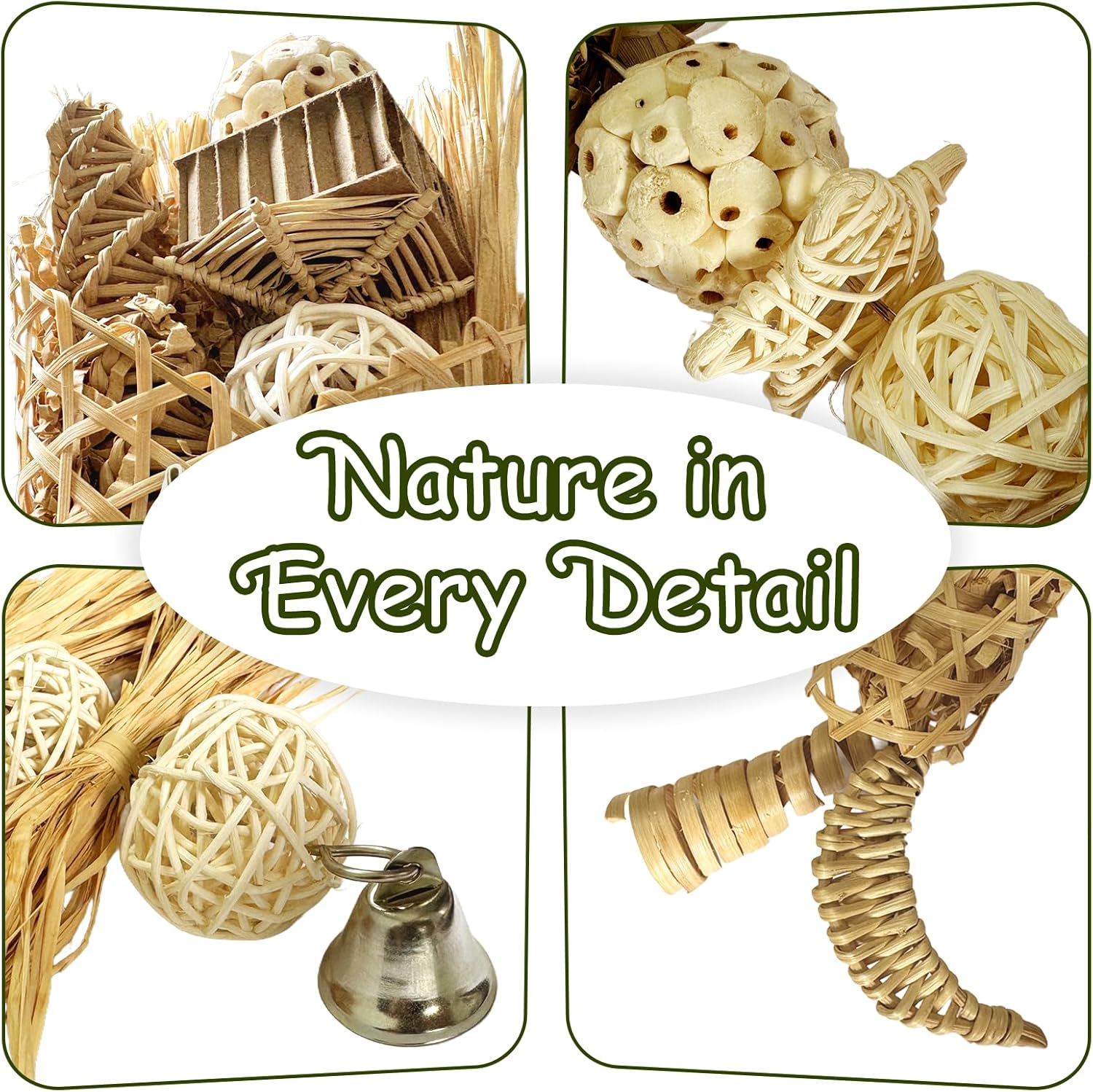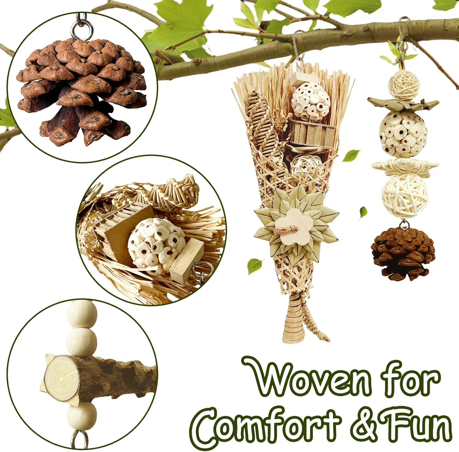 • All-Natural Materials, No Plastic or Dye: Crafted from bamboo, rattan balls, wooden beads, prickly ash wood, sola balls, pine cone, rattan column, and corn husk, this set of natural bird toys offers a safe and engaging chewing experience. No harmful chemicals—just pure nature for your bird's beak.