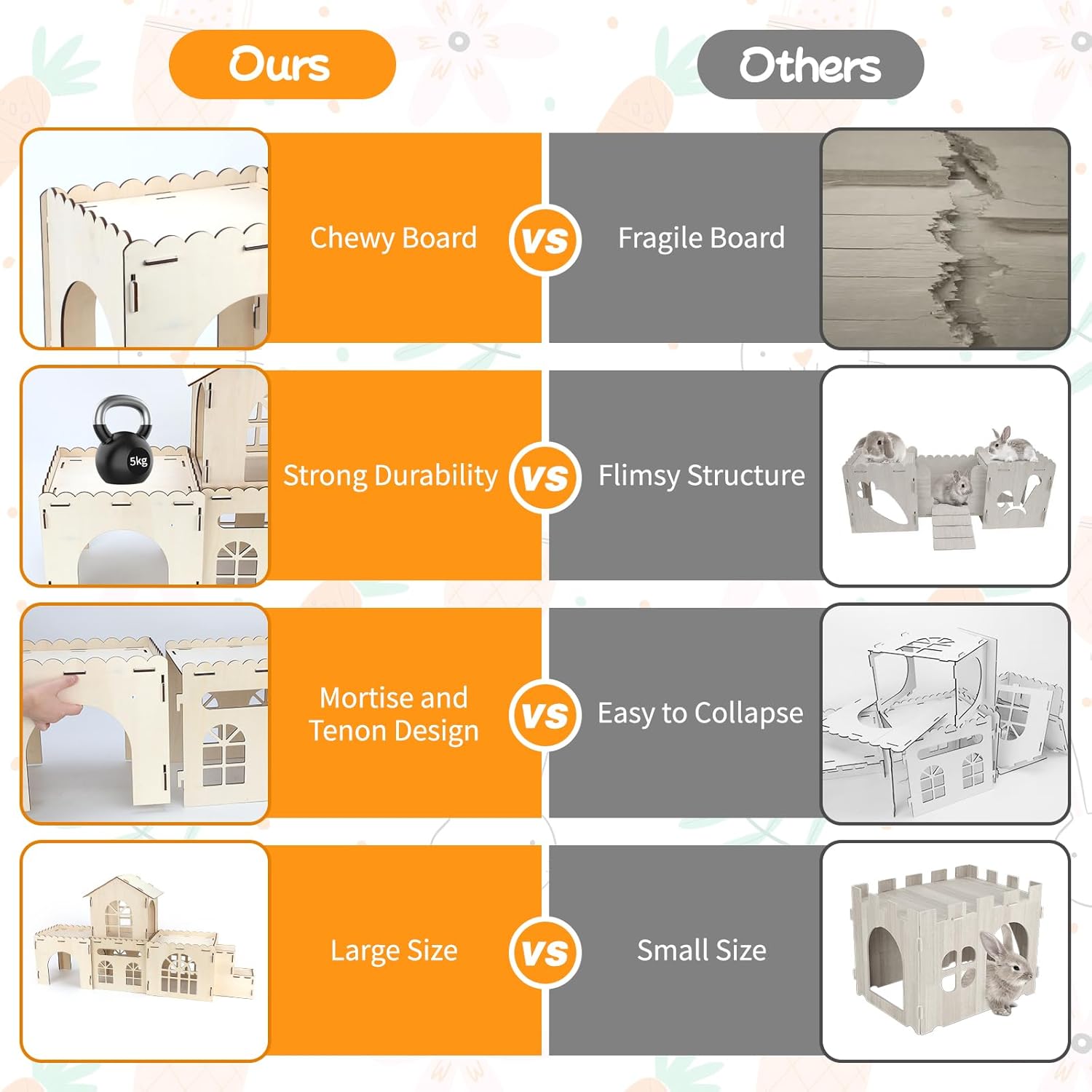 • Safe and Durable Bunny House: Crafted from 5mm-thick natural pine wood with smooth, splinter-free edges for your pet’s safety; This bunny castle’s sturdy construction ensures durability and stability, offering a secure space for medium-sized rabbits to explore and relax