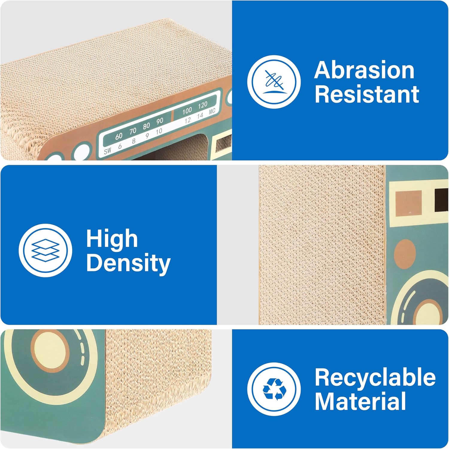 • Radio-shaped Cat Scratcher: Featuring a fun and aesthetically pleasing design, this scratcher offers various play and exercise surfaces, resembling a radio shape to entice cats with engaging scratching options and a visually appealing structure.