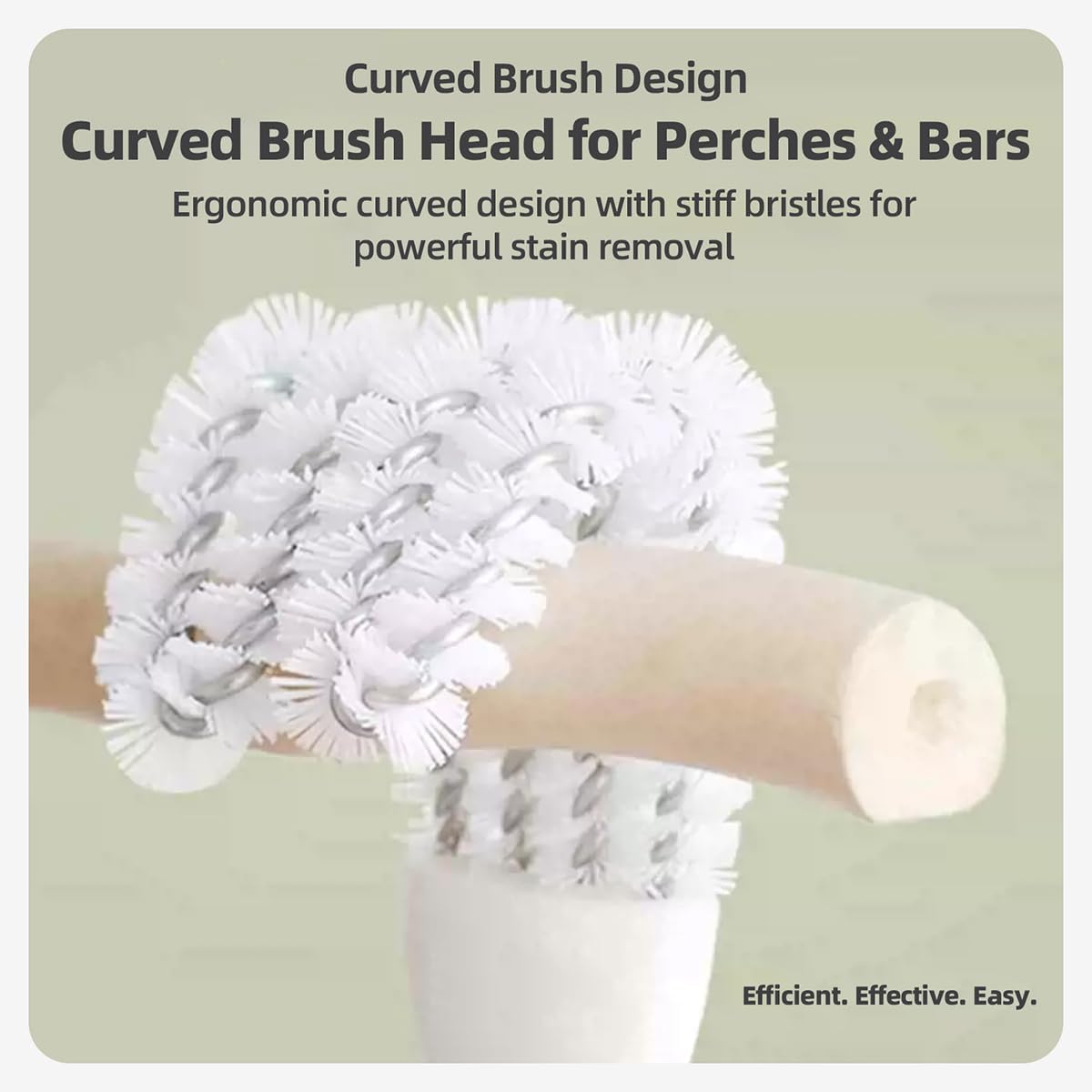 • Curved Brush Head for Precision Cleaning โ€” Flexible angled bristles contour around perches, feeders, and cage bars to scrub stubborn droppings and food residue from tight spaces, ensuring thorough sanitation for parrots, cockatiels, and other pet birds