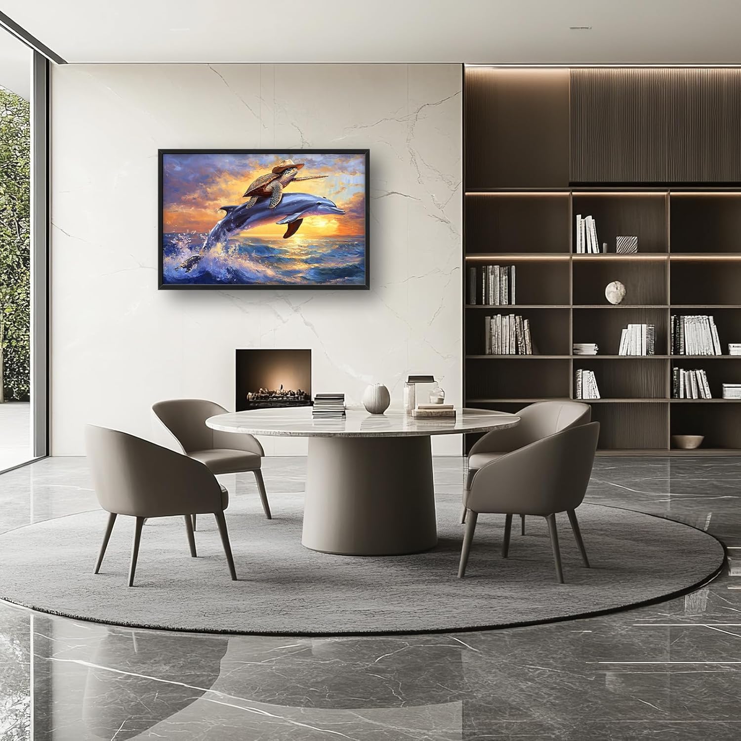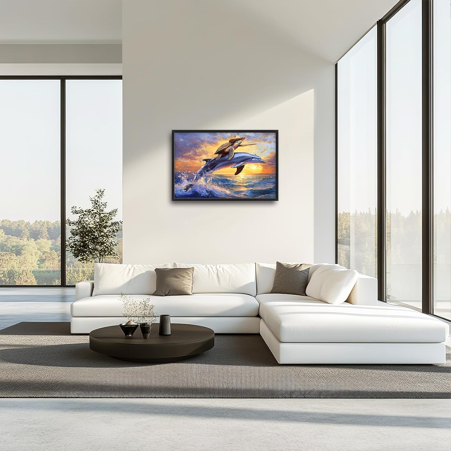 Large Funny Sea Turtle Wall Art for Living Room, Framed Oversized Ocean Dolphin Wall Decor Sunset Nautical Canvas Painting Modern Artwork Home Decoration for Bedroom Office 36"x24"