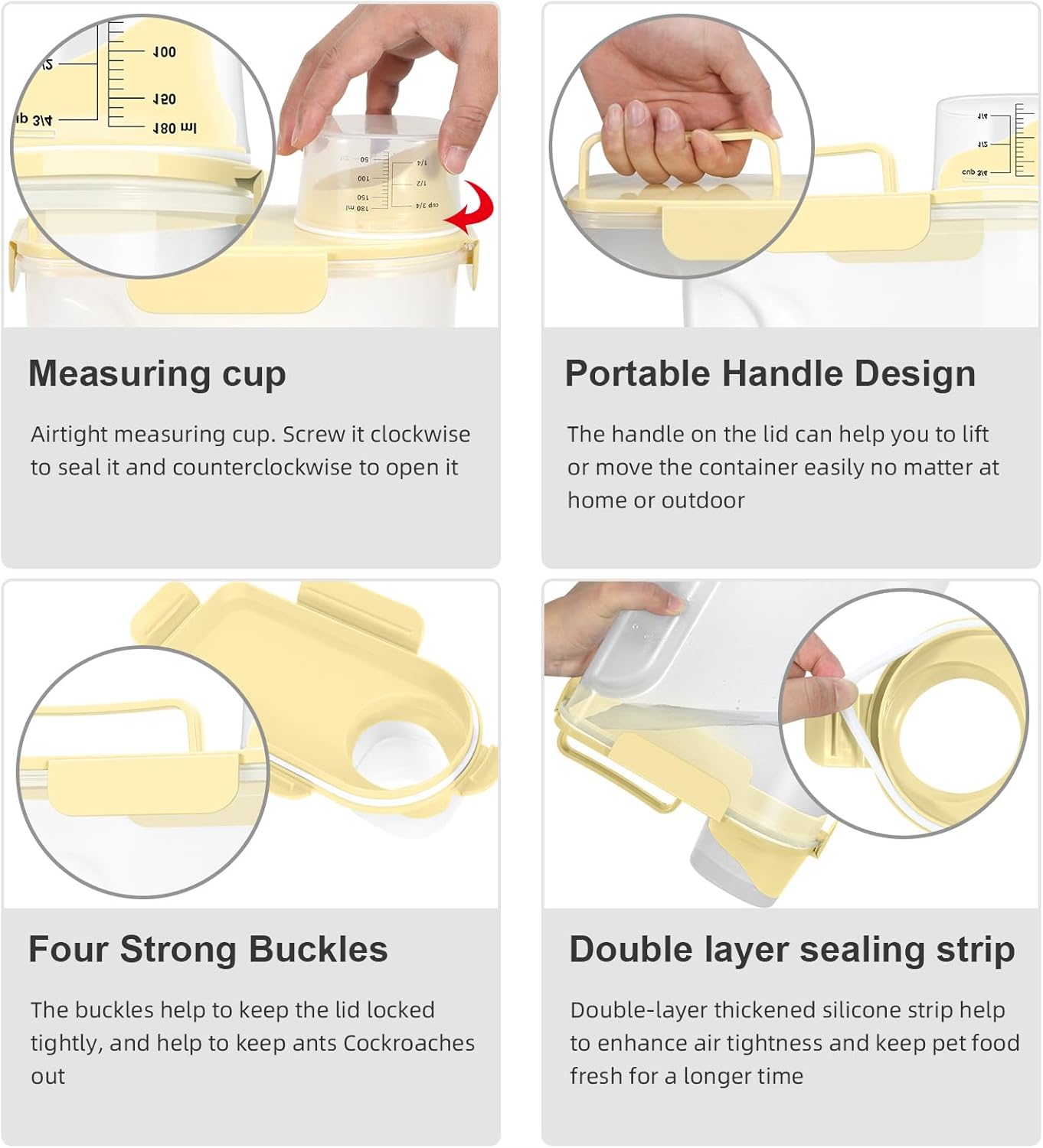 • WHAT YOU GET?:The small dog food bin comes with a 1-pack airtight pet food storage container with a clear measuring cup and an upgraded large spout for easy pouring of pet food at any time. This dog food storage containers can be a gift The perfect gift for any home.