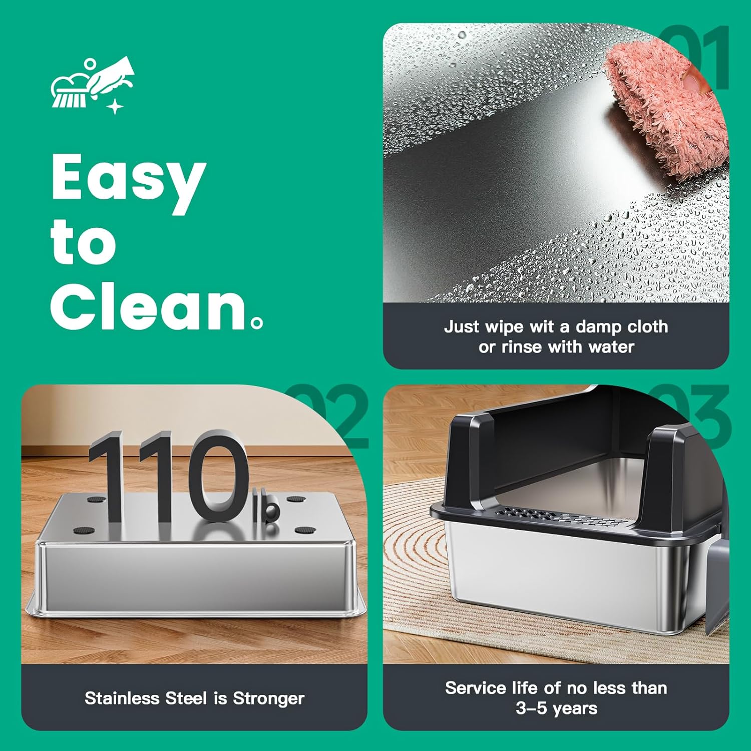 • 【EASY TO CLEAN】The unique metal material of the extra large stainless steel litter box covered is very easy to clean, just use a wet rag or rinse it to get it clean as new