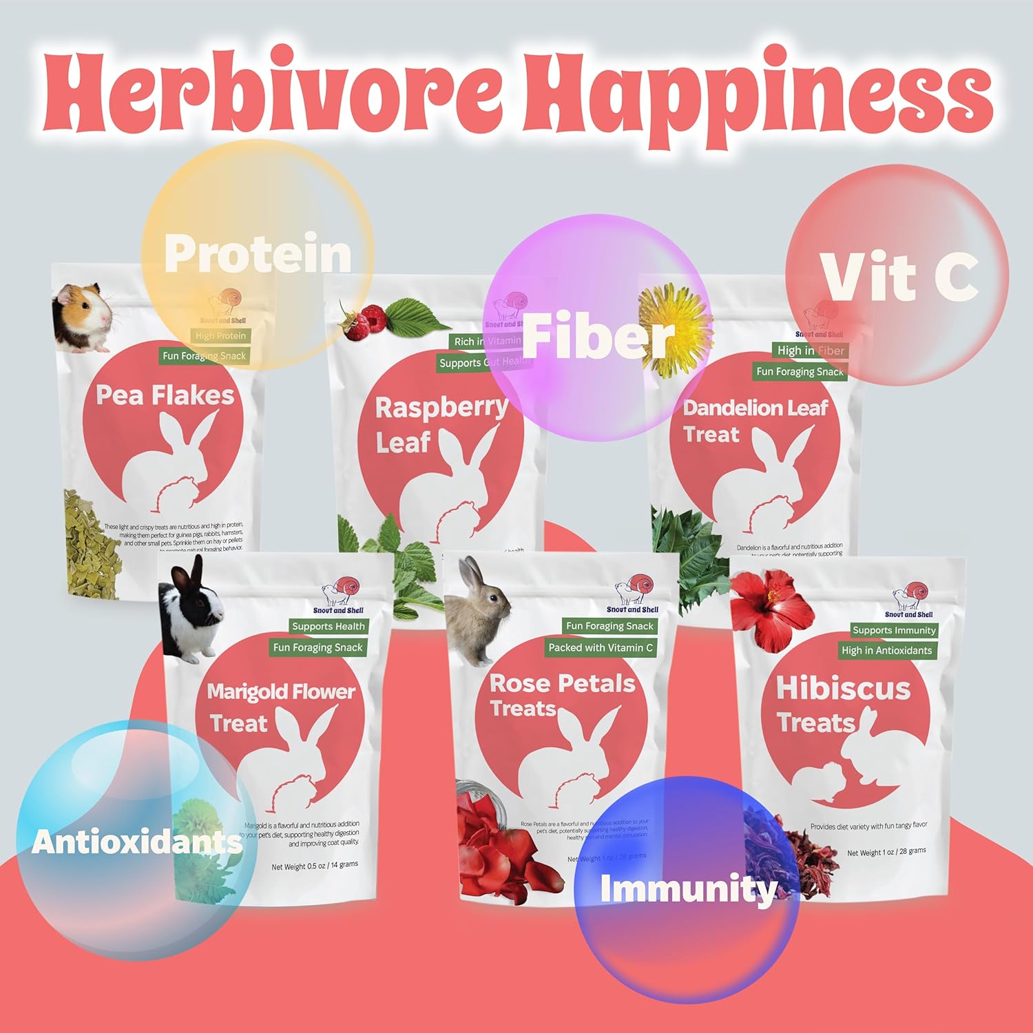 Snout and Shell Small Pet Mega Pack – 6 Natural Treats: Pea Flakes, Dandelion, Raspberry Leaf, Marigold, Rose Petals & Hibiscus – For Rabbits, Guinea Pigs, Chinchillas & More – Foraging & Health Boost