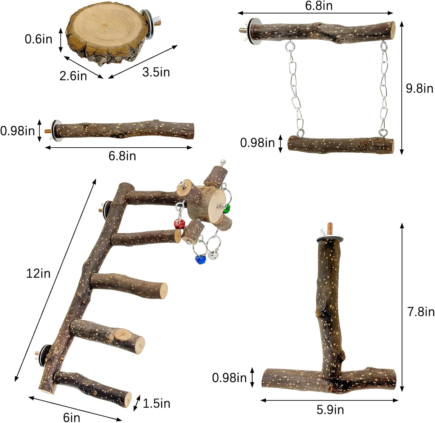• 6Pack Bird Ladder Perches: Package includes Bird ladder X 1, T Shaped Perch X 1, O Shaped Paltform X 1, Wooden Perch X 2, Bird Swing X1. Design a natural bird habitat with varied perches to support daily rest, play, and instinctive behaviors
