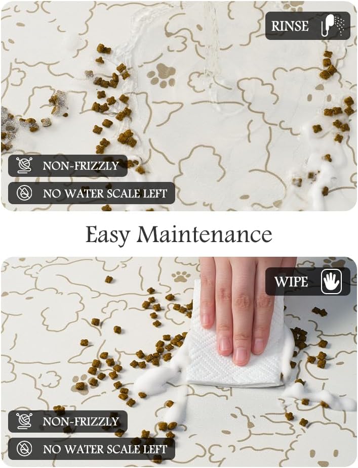 • Keep Clean & No Stains:No marks will be left when food and water are dropped on the dog food mat. Unlike traditional silicone pet feeding mats, our pet feeding mat for food and water won't pick up pet hair or dust, and won't build up tough-to-clean limescale, keeping the dog bowl mat as good as new forever.
