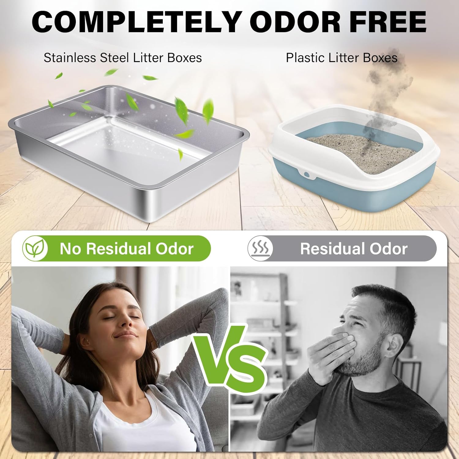 • The small stainless steel litter box doesn't retain unpleasant odors. The smooth surface of the metal litter box is comfortable to the touch for both you and your cats.