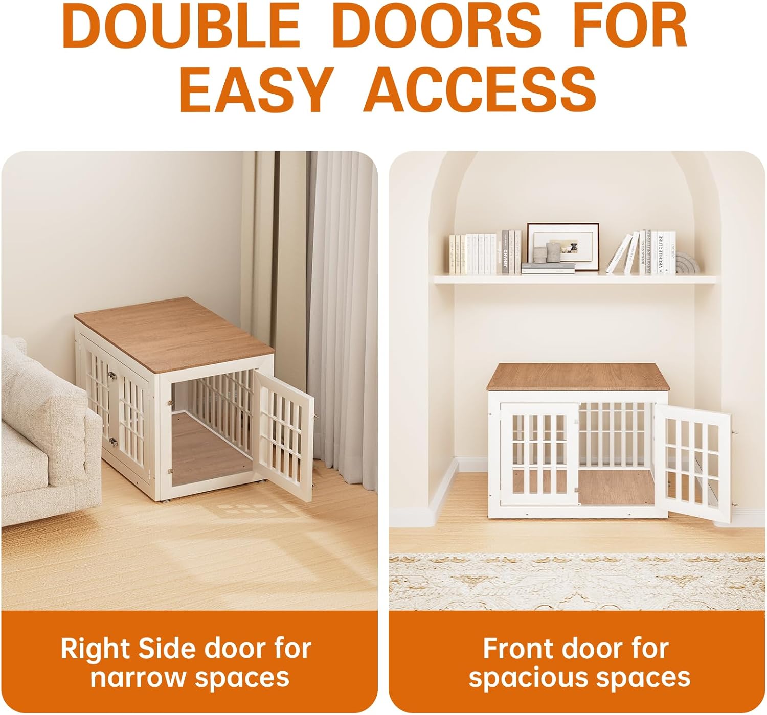 • 【Double Doors Design】The dog kennel furniture has a front door and a side door, your pet will go in and out easily with double doors. The double-doors design can adapt to more different space environments. You can decide whether to open the front door or the side door according to your needs.