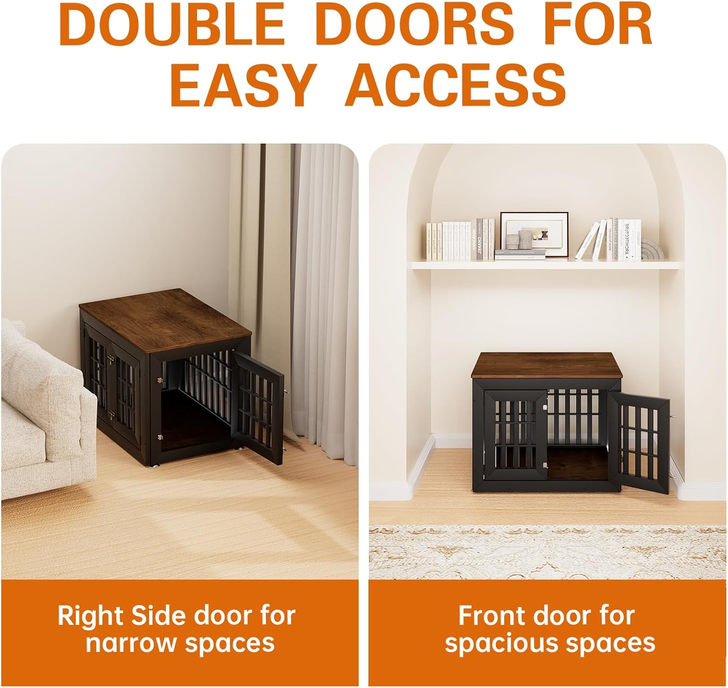• 【Double Doors Design】The dog kennel furniture has a front door and a side door, your pet will go in and out easily with double doors. The double-doors design can adapt to more different space environments. You can decide whether to open the front door or the side door according to your needs.