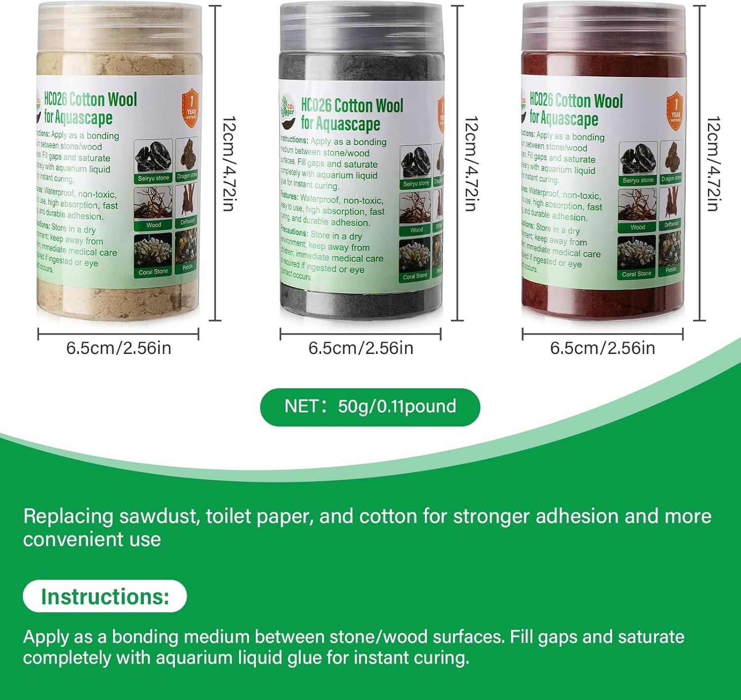 • Professional Bonding and Filling:This product is specially designed for aquarium landscaping and is recommended to be used with aquatic liquid glue. When bonding rocks or driftwood, uneven surfaces may result in insufficient contact area and weak adhesion. Simply add a small amount of this bonding medium cotton between the bonding surfaces to fill gaps and increase contact area. After saturating it with liquid glue, the bond will solidify into an ultra-strong hold, ensuring a durable and stable aquascape structure.