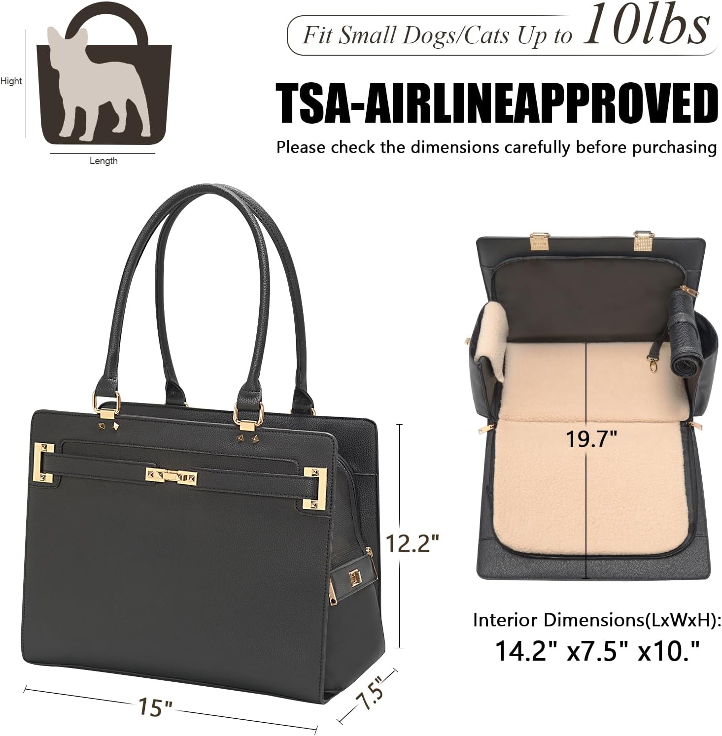 • Spacious Pet Bag Carrier:Designed with a roomy interior to give your pet plenty of space to sit, lie down comfortably. Carrier Dimensions(LxWxH): 15inch x 7.5inch x 12.2inch. Interior Dimensions(LxWxH): 14.2inch x 7.5inch x 10.6inch. We recommend this pet carrier for pets under 10 lbs. Please check the dimensions carefully before purchasing to ensure it fits your dog/cat/rabbit/other pets