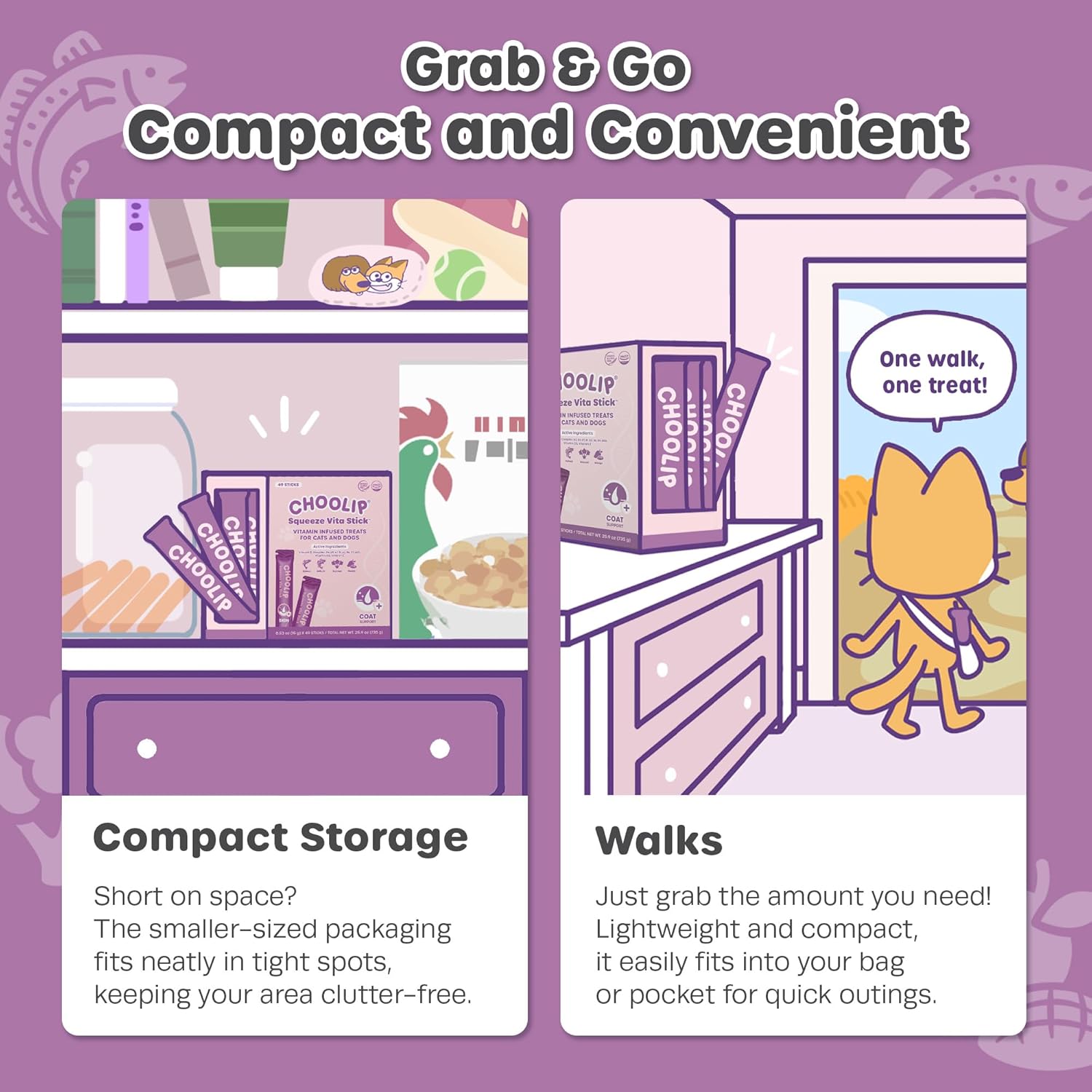 • COMPACT DISPENSER PACK: This Skin and Coat Support pack includes 49 sticks to treat your cat or dog. Itโ€™s perfect for quick, grab-and-go use, easy to carry in a bag for trips, or convenient to keep near your pet supplies.