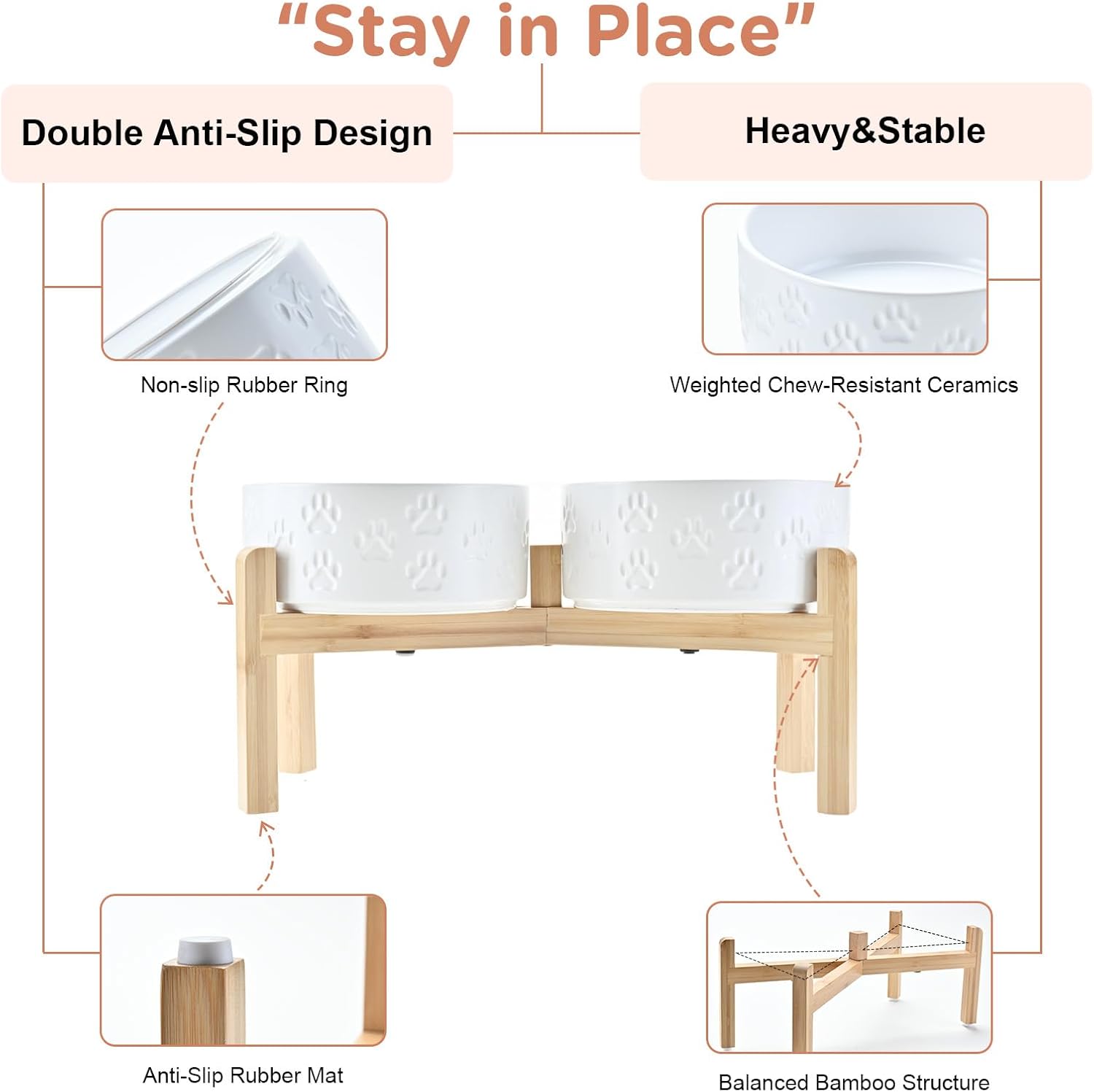 • Stable, Tip‑Resistant Design – A solid bamboo frame with Chew‑Resistant Heavyweight Ceramic, wide stance, and slip‑proof silicone pads join forces to create raised dog bowls that STAY IN PLACE on tile, wood, or laminate. Fewer spills mean cleaner floors and no accidental gouges or scratches or noisy