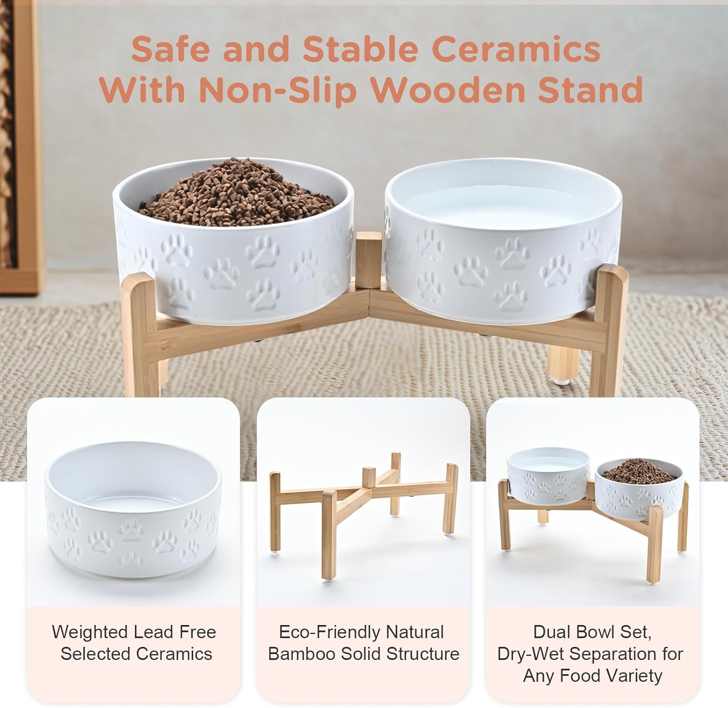 SPUNKYJUNKY Elevated Dog Bowls Ceramic, 7.3'' Dogs Food Water Bowls Raised with Non-Slip Bamboo Stand for Medium to Large Sized Breed Microwave Dishwasher Safe - 42 OZ,Paw White