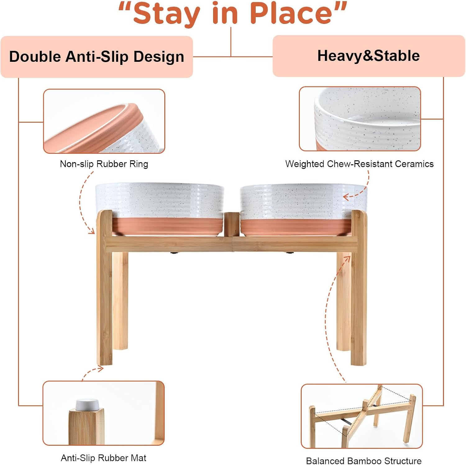 • Stable, Tip‑Resistant Design – A solid bamboo frame with Chew‑Resistant Heavyweight Ceramic, wide stance, and slip‑proof silicone pads join forces to create raised dog bowls that STAY IN PLACE on tile, wood, or laminate. Fewer spills mean cleaner floors and no accidental gouges or scratches or noisy