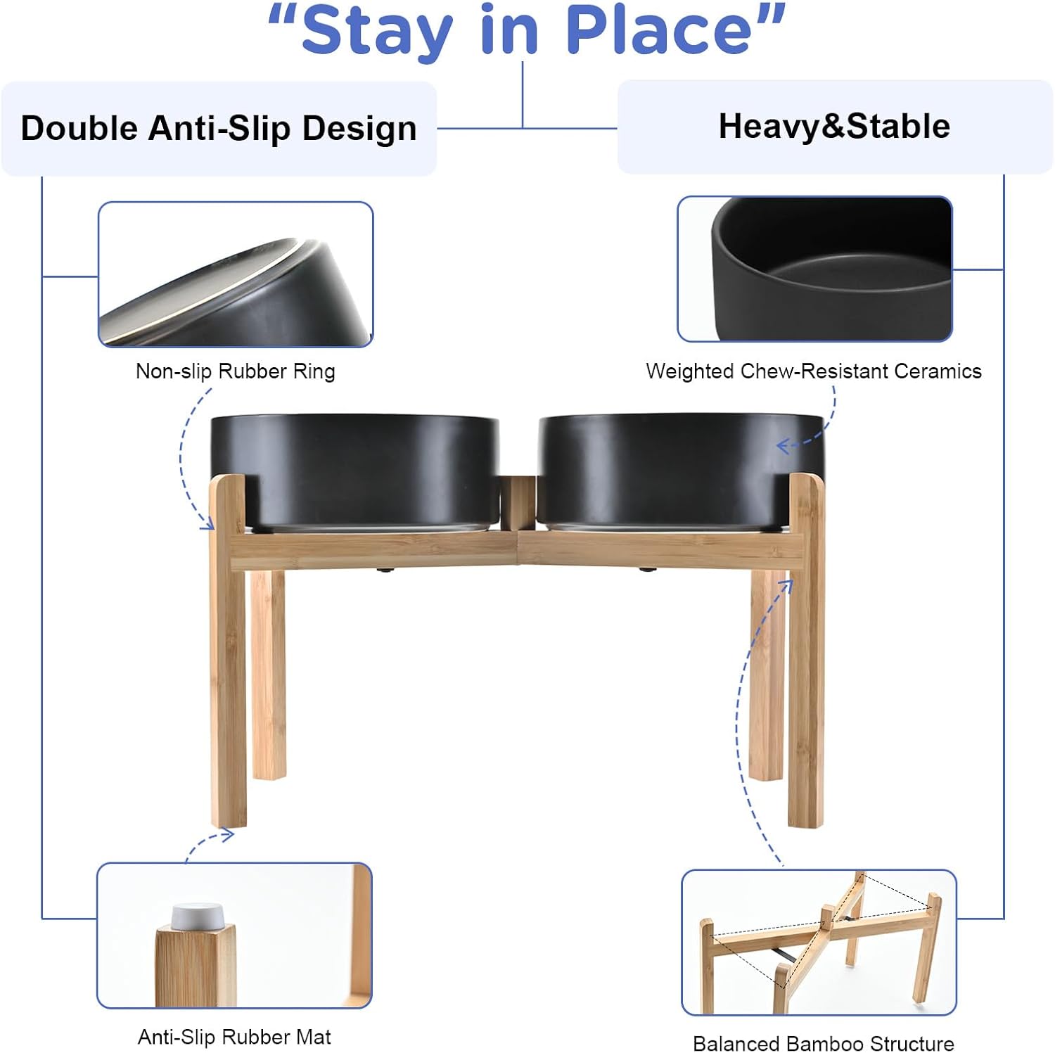 • Stable, Tip‑Resistant Design – A solid bamboo frame with Chew‑Resistant Heavyweight Ceramic, wide stance, and slip‑proof silicone pads join forces to create raised dog bowls that STAY IN PLACE on tile, wood, or laminate. Fewer spills mean cleaner floors and no accidental gouges or scratches or noisy