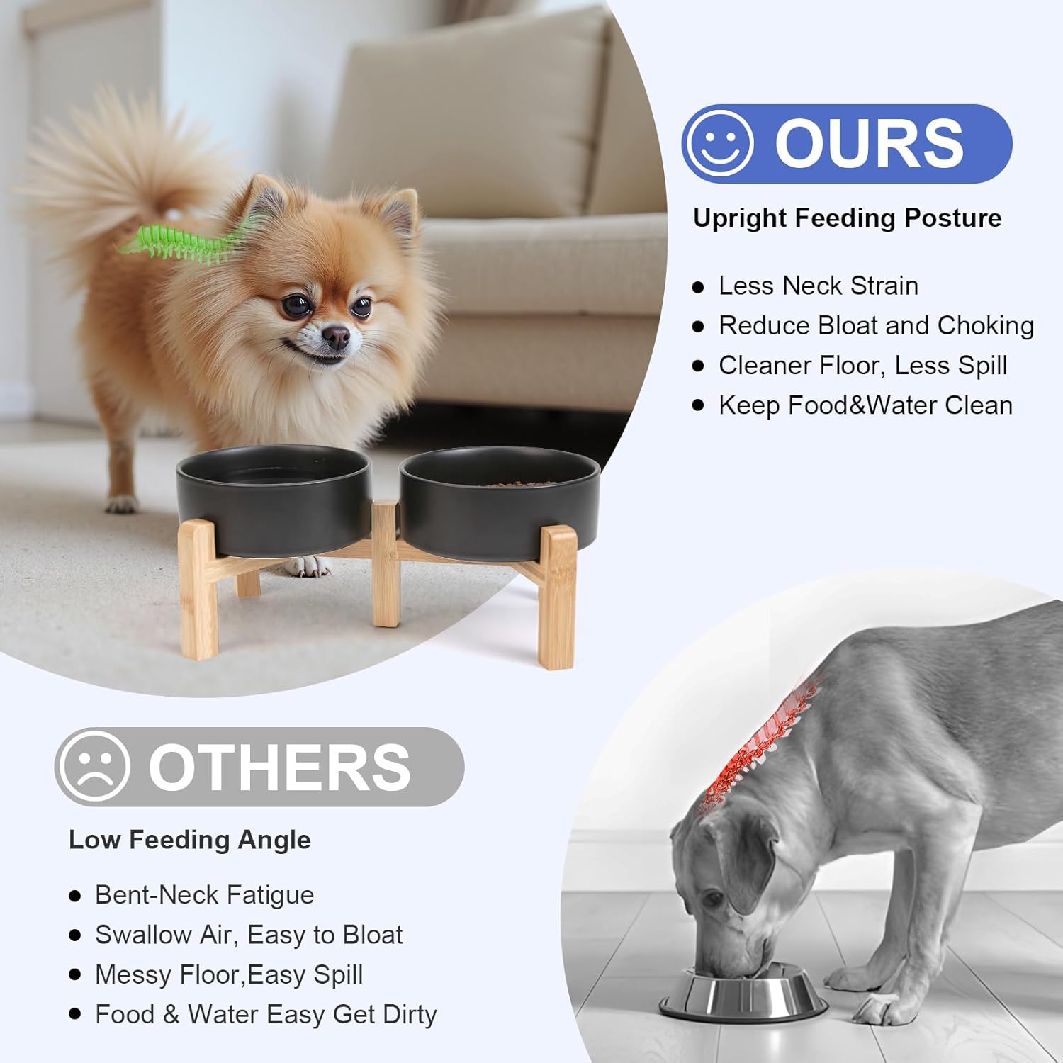 • Stable, Tip‑Resistant Design – A solid bamboo frame with Chew‑Resistant Heavyweight Ceramic, wide stance, and slip‑proof silicone pads join forces to create raised dog bowls that STAY IN PLACE on tile, wood, or laminate. Fewer spills mean cleaner floors and no accidental gouges or scratches or noisy