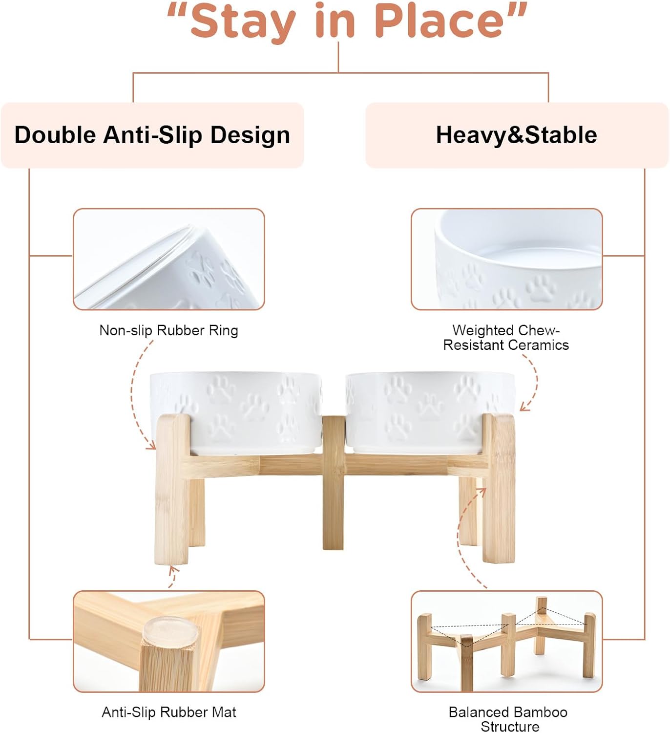 • Stable, Tip‑Resistant Design – A solid bamboo frame with Chew‑Resistant Heavyweight Ceramic, wide stance, and slip‑proof silicone pads join forces to create raised dog bowls that STAY IN PLACE on tile, wood, or laminate. Fewer spills mean cleaner floors and no accidental gouges or scratches or noisy