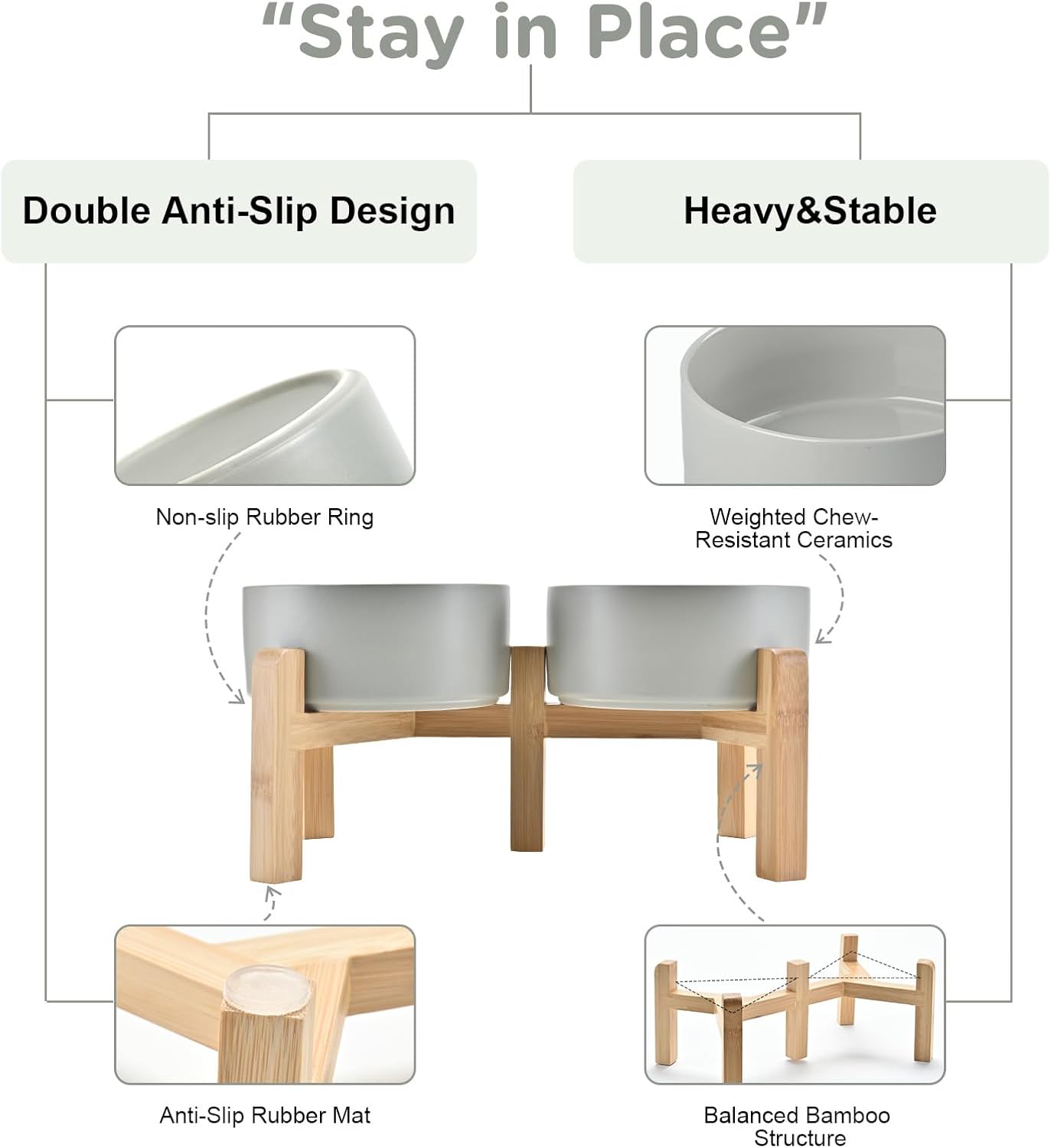 • Stable, Tip‑Resistant Design – A solid bamboo frame with Chew‑Resistant Heavyweight Ceramic, wide stance, and slip‑proof silicone pads join forces to create raised dog bowls that STAY IN PLACE on tile, wood, or laminate. Fewer spills mean cleaner floors and no accidental gouges or scratches or noisy