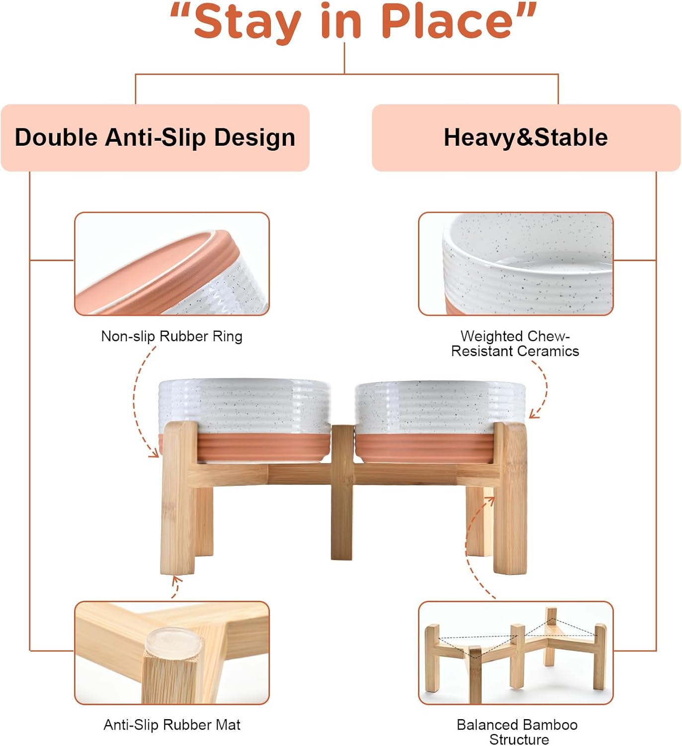• Stable, Tip‑Resistant Design – A solid bamboo frame with Chew‑Resistant Heavyweight Ceramic, wide stance, and slip‑proof silicone pads join forces to create raised dog bowls that STAY IN PLACE on tile, wood, or laminate. Fewer spills mean cleaner floors and no accidental gouges or scratches or noisy
