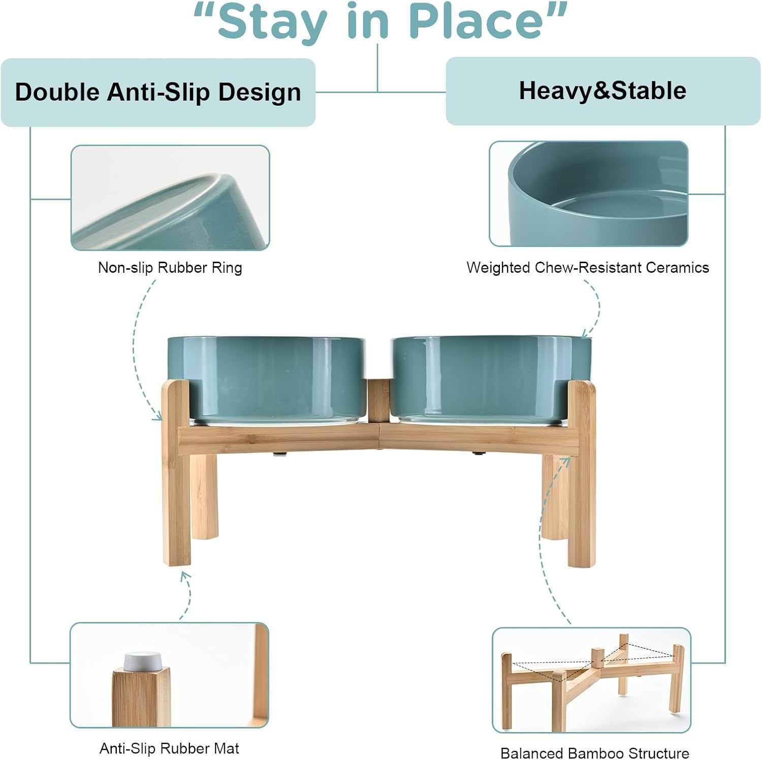 • Stable, Tip‑Resistant Design – A solid bamboo frame with Chew‑Resistant Heavyweight Ceramic, wide stance, and slip‑proof silicone pads join forces to create raised dog bowls that STAY IN PLACE on tile, wood, or laminate. Fewer spills mean cleaner floors and no accidental gouges or scratches or noisy