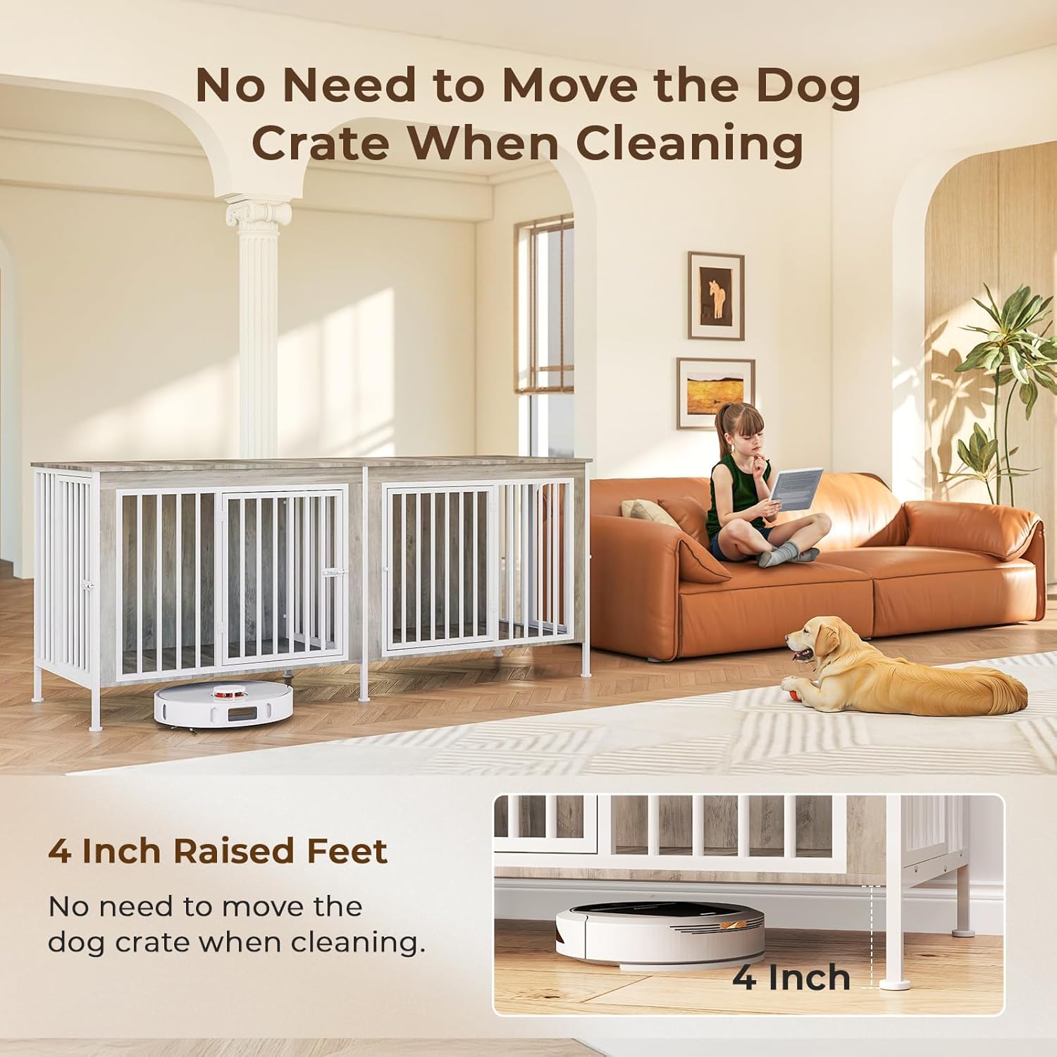 • Robot-Friendly & Easy to Clean: Raised 3.94 inches off the ground, dog crate furniture supports sweeping robots to pass through easily, making daily cleaning a breeze. The elevated base also prevents moisture buildup and keeps the bottom dry and hygienic for your pets