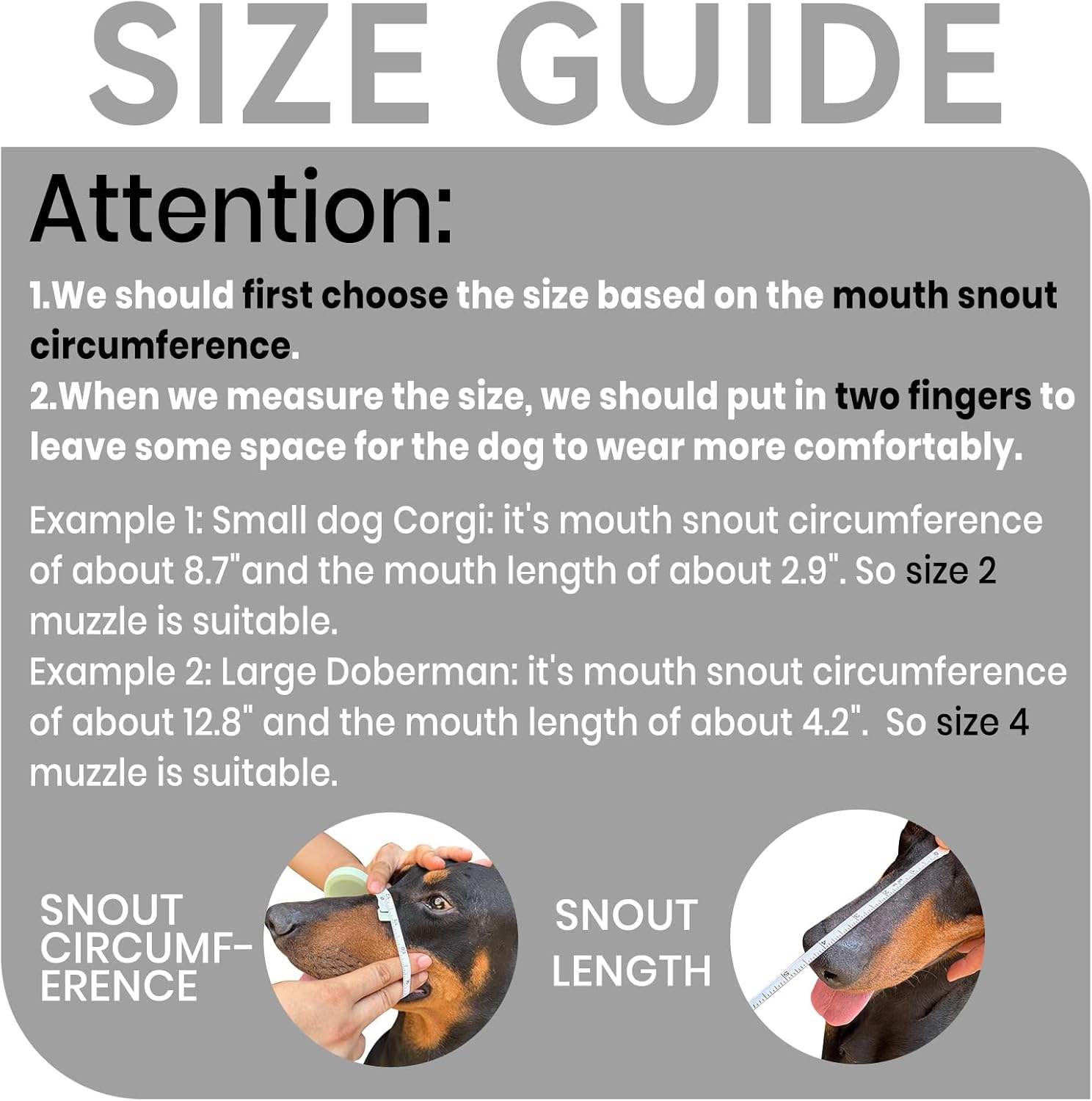 • PLEASE MEASURE BEFORE BUYING:Measure both snout circumference and snout length before purchasing. If your dog's snout length exceeds the size range by about 1 inch, choose the next size up. For long-snout breeds like Dobermans, make sure the snout length fits as well.