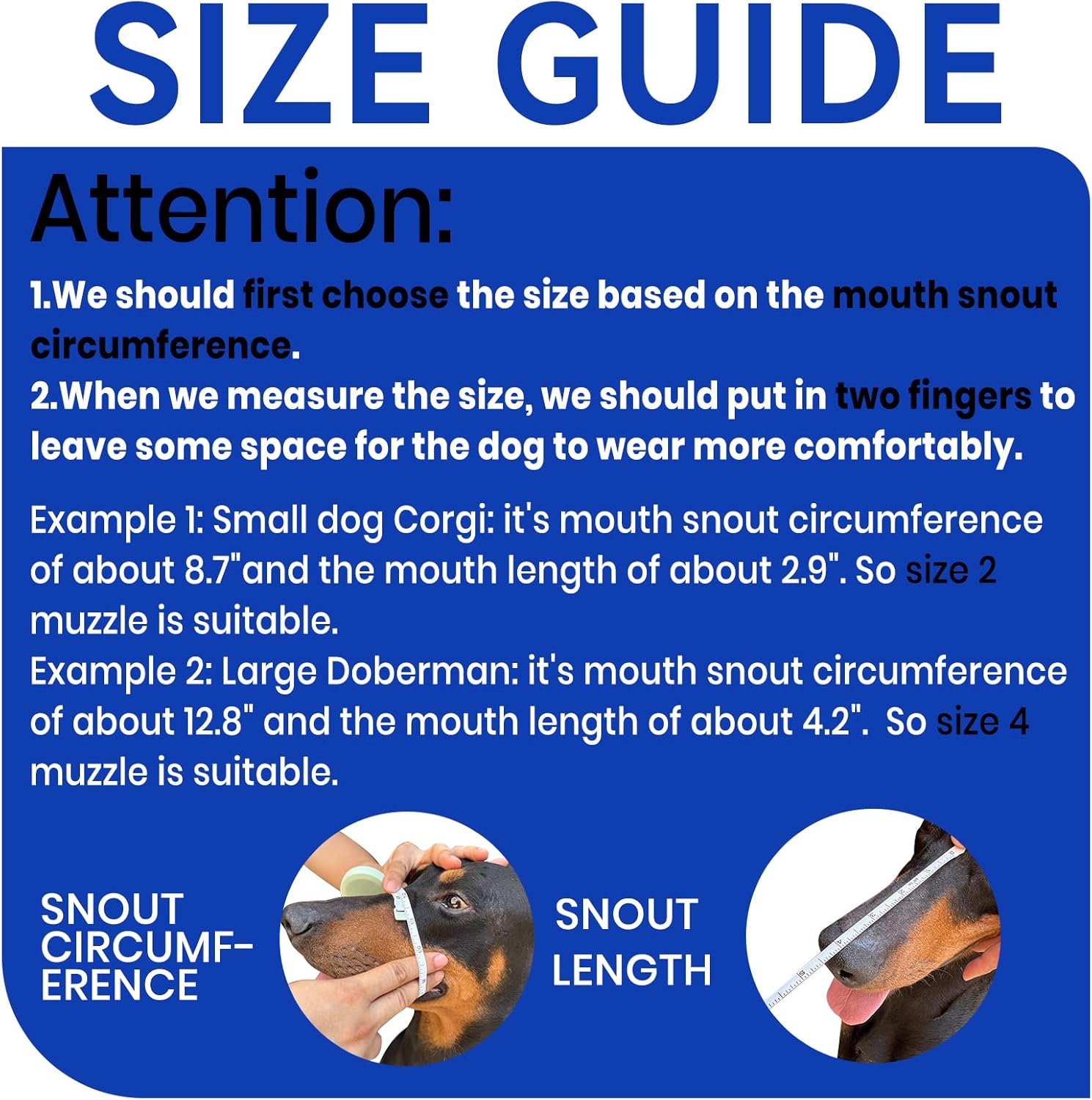 • PLEASE MEASURE BEFORE BUYING:Measure both snout circumference and snout length before purchasing. If your dog's snout length exceeds the size range by about 1 inch, choose the next size up. For long-snout breeds like Dobermans, make sure the snout length fits as well.