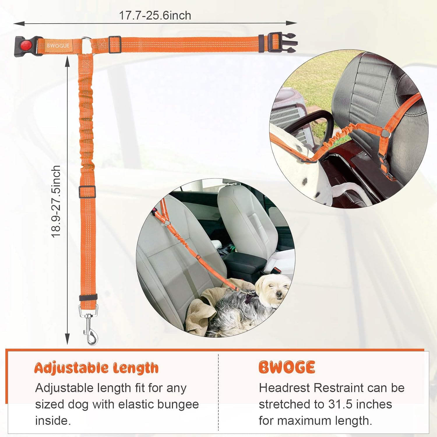 • ADJUSTABLE LENGTH: Dogs come in different sizes and weights. With buckle on the straps and the elastic bungee inside, The BWOGE Headrest Restraint is adjustable between 18.9-27.5 inches and can be stretched to 31.5 inches for the maximum length. The circle can be adjusted from 17.7 inches to 25.6 inches.You can easy to adjust the dog leash to the suitable length to keep your pet in a safety state.