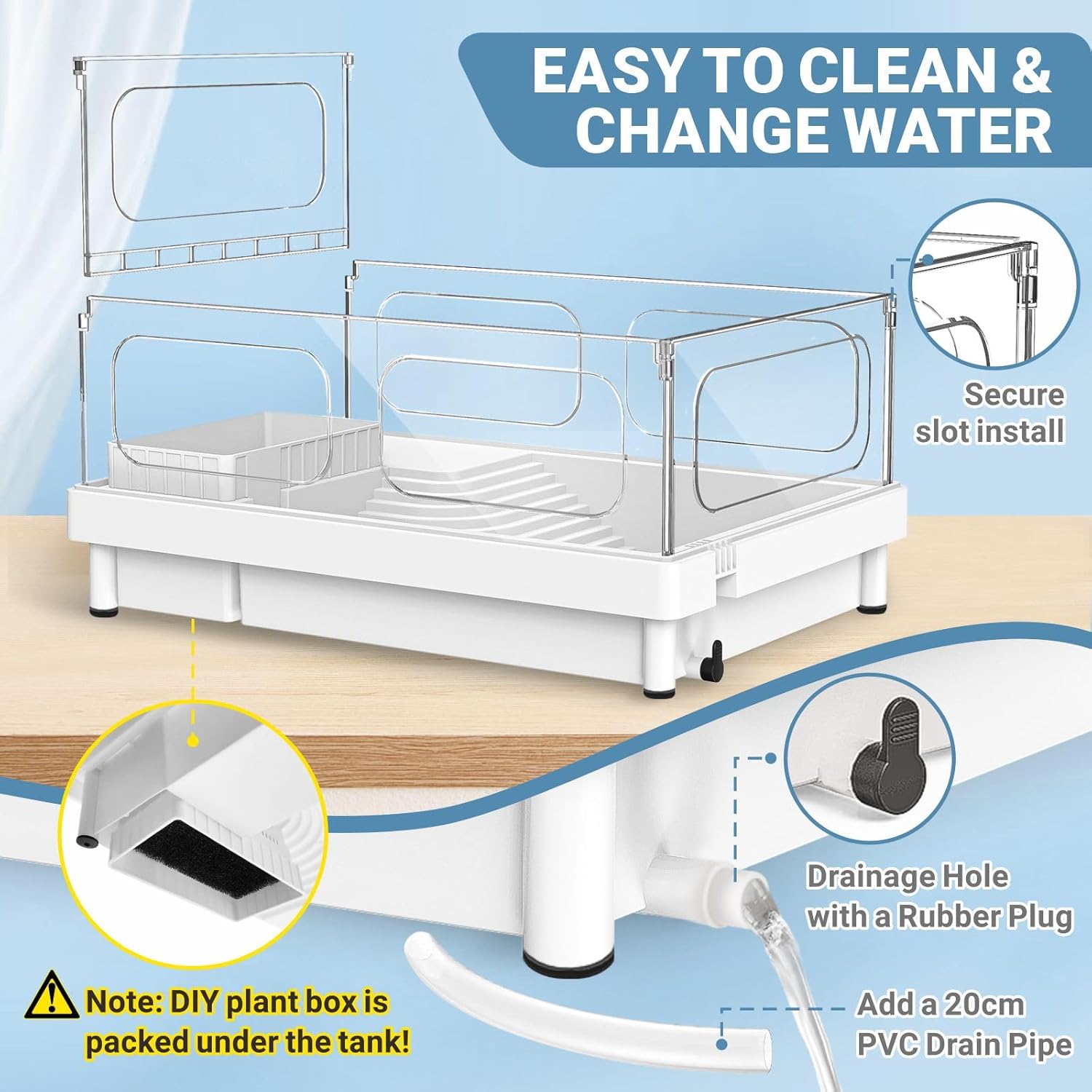 • 【EASY TO USE AND CLEAN】Keep your turtle tank clean and hassle-free with bottom drainage feature. Simply drain the water, remove debris, and refill for a healthier habitat. There is a DIY plant box is packed under the tank, you can use our included colored stones and trees to decor the landscape of the turtle aquarium.