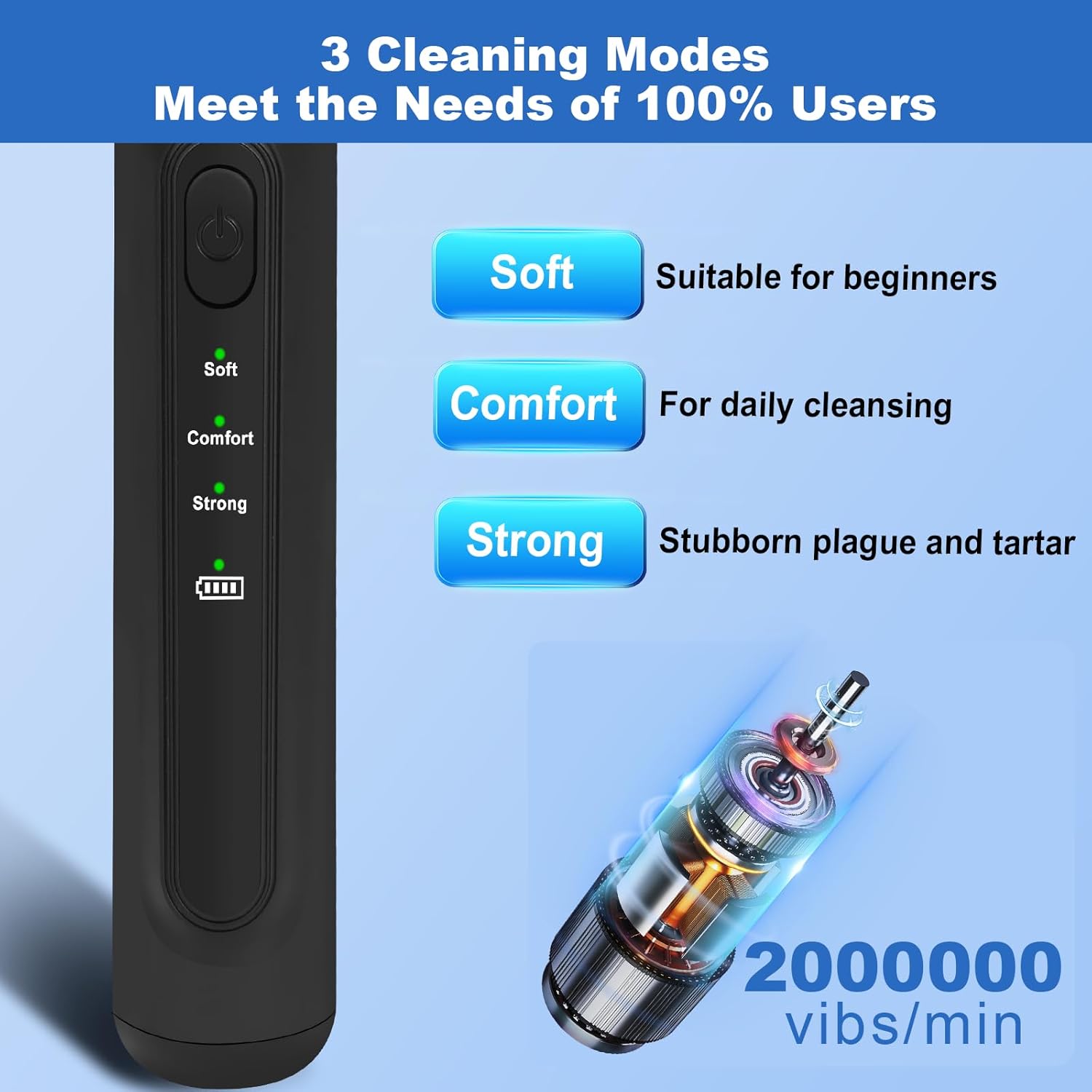 • Easy to Use & Complete Kit : Three modes (soft, comfort, strong) suit needs—start with soft for first use. A button press reduces buildup. It includes an ultrasonic cleaner, 2 heads, a dental probe, and a wrench for home care